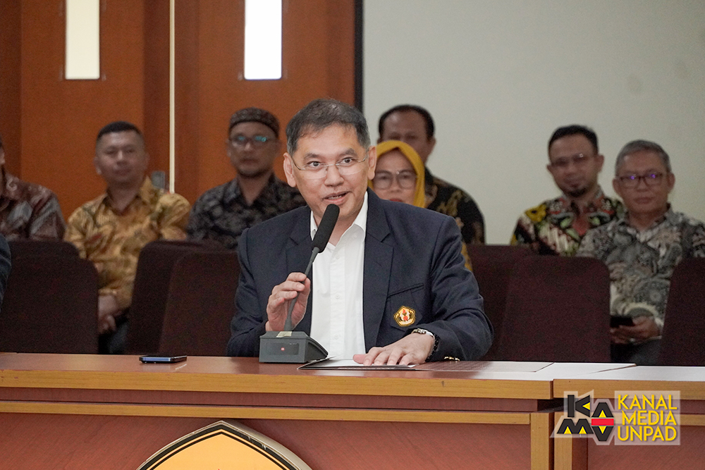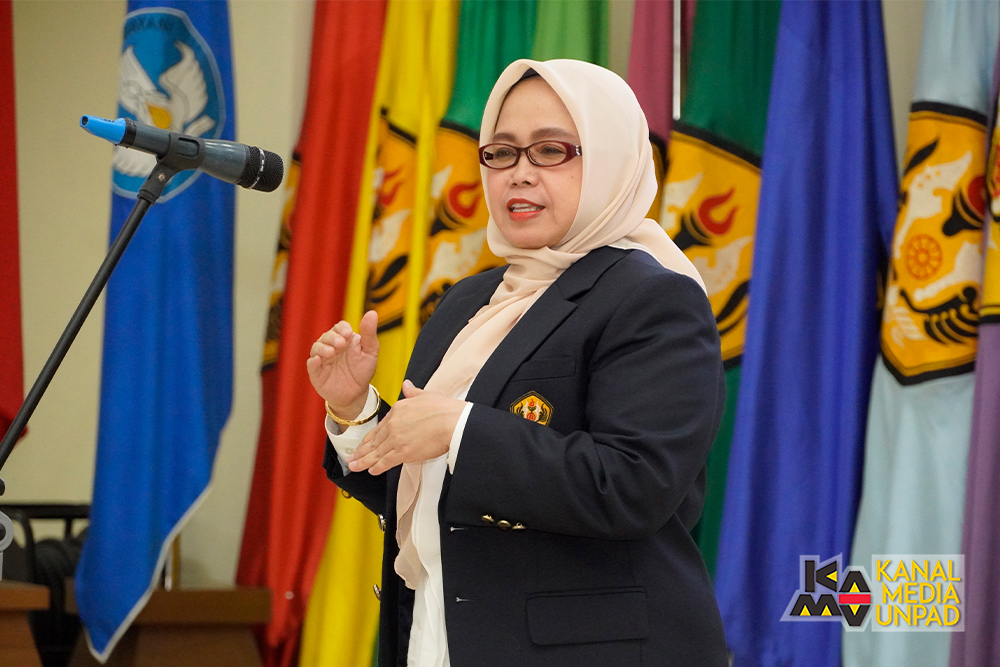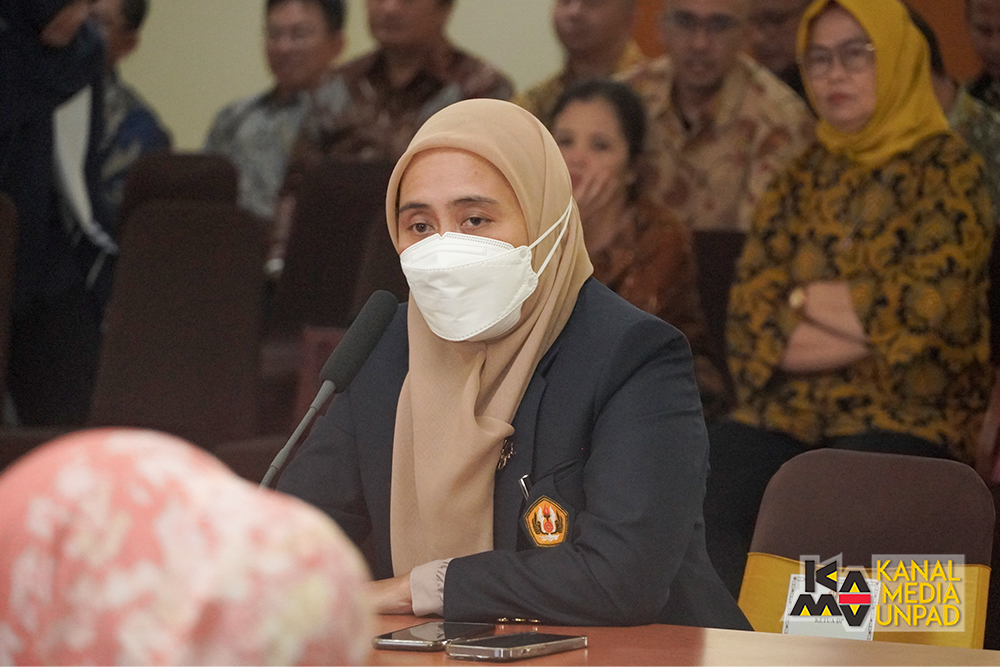 Sekretaris Dewan Profesor Unpad, Prof. Arlette Suzy Puspa Pertiwi, menyampaikan pesan Ketua Dewan Profesor Unpad, Prof. Arief Anshory Yusuf yang tidak dapat hadir karena ada kegiatan di Dewan Ekonomi Nasional di Jakarta.