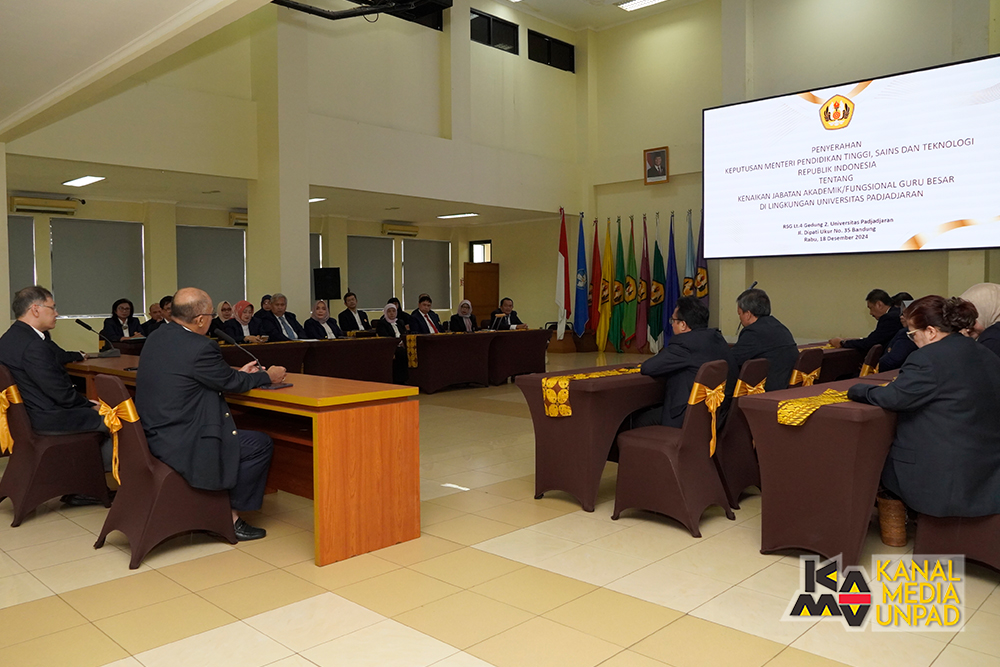 [Kanal Media Unpad] Universitas Padjadjaran memiliki 15 Guru Besar baru dari 7 fakultas. Rektor Universitas Padjadjaran menyerahkan Surat Keputusan Menteri Pendidikan Tinggi, Sains dan Teknologi kepada para Guru Besar tersebut di Ruang Serba Guna, Gedung 2 Lantai 4 Unpad Jl. Dipati Ukur No. 35 Bandung, Rabu 18 Desember 2024.