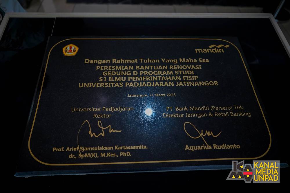 [Kanal Media Unpad] Rektor Universitas Padjadjaran, Prof. Arief S. Kartasasmita dan Direktur Jaringan & Retail Banking Bank Mandiri, Aquarius Rudianto, meresmikan Hasil Bantuan Renovasi Gedung D Program Studi S1 Ilmu Pemerintahan FISIP Unpad di Jatinangor, Jumat 21 Maret 2025.