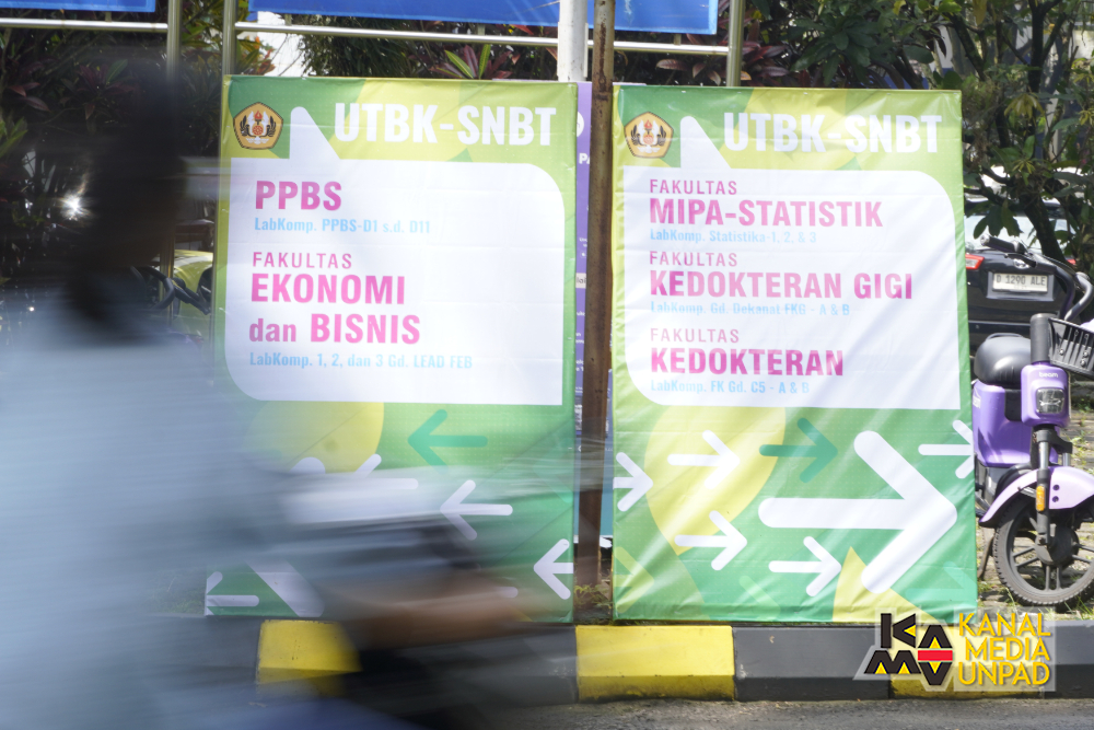 Poster penunjuk arah lokasi UTBK di Unpad Kampus Jatinangor. Pelaksanaan UTBK akan dimulai besok Rabu 23 April hingga 4 Mei 2025, peserta disarankan mengecek lokasi sebelum hari ujian masing-masing. (Foto oleh: Jalasenastri Saprala)*