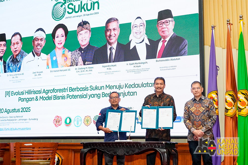 [Kanal Media Unpad] Universitas Padjadjaran melalui Fakultas Pertanian dan Fakultas Teknologi Industri Pertanian menjalin kolaborasi strategis dengan Yayasan Sukun Nusantara Sejahtera, Koperasi Wana Mandiri, dan Koperasi Agripadja Pangan Nusantara. Kerja sama ini ditandai dengan penandatanganan perjanjian bersama yang digelar dalam kegiatan Seminar Nasional & Expo bertajuk “Hilirisasi Agroforestri Berbasis Sukun” yang diselenggarakan oleh Faperta dan FTIP Unpad di Bale Sawala, Gedung Rektorat Unpad, Kampus Jatinangor, Rabu 20 Agustus 2025.