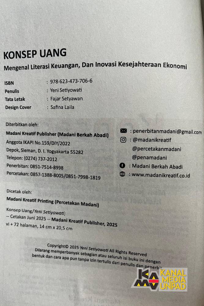 [Kanal Media Unpad] Mahasiswa Program Studi Administrasi Keuangan Publik Sekolah Vokasi Universitas Padjadjaran, Yeni Setiyowati, menerbitkan buku berjudul “Konsep Uang: Mengenal Literasi Keuangan dan Inovasi Kesejahteraan Ekonomi” yang terbit pada tahun 2025 melalui penerbit CV. Madani Berkah Abadi dengan nomor ISBN 978-623-473-706-6. Karya ini hadir sebagai wujud kontribusi Yeni dalam memperluas pemahaman masyarakat, khususnya generasi muda, mengenai pentingnya literasi keuangan di tengah dinamika ekonomi yang terus berkembang.