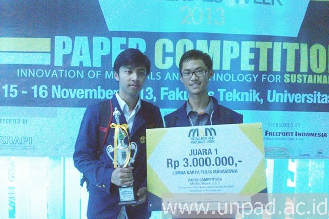 [Unpad.ac.id, 18/11/2013] Two students of Unpad Faculty of Geology Engineering, Nanda Najih Habibil Afif and Rania Abdullah won the first place in the Paper Competition organized by the University of Indonesia Faculty of Engineering (FT UI). The event is an annual event held in the Metallurgy and Material’s Week (MnM’s Week) with the theme “Innovations in materials and Technologies for Sustainable Energy”. Each participant submits his research paper related to the of the world energy