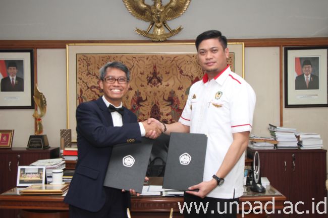 Rektor Unpad, Prof. Tri Hanggono Achmad, dan Bupati Gowa, Adnan Purichta Ichsan Yasin Limpo, usai penandatanganan MoU di Ruang Rektor Unpad, Jln. Dipati Ukur 35 Bandung, Rabu (30/03). (Foto oleh: Tedi Yusup)*