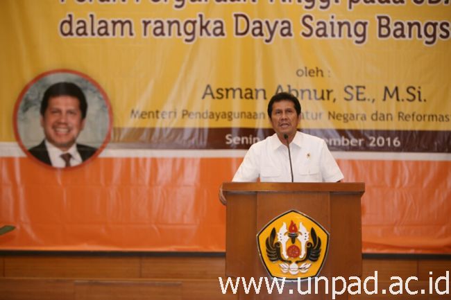 [Unpad.ac.id, 19/09/2016] Universities have an important role in creating a reliable human resources to bring Indonesia to compete in the international world. Minister of Administrative and Bureaucratic Reform, Asman Abnur, SE., M.Si pointed this while giving an inaugural lecture for Graduate Program Unpad, at Graha Sanusi Hardjadinata Unpad, Jln. Dipati Ukur No. 35 Bandung, Monday (9/19).