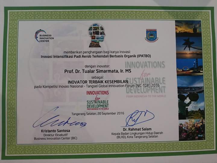 Prof. Tualar along with 9 other innovators was chosen based on innovation research to support the implementation of the Sustainable Development Goals (SDGs) in Indonesia. In the competition, Prof. Tualar won an award for his efforts in developing the “Innovation-Based Controlled Aerobic Rice Intensification Organic” (IPATBO).