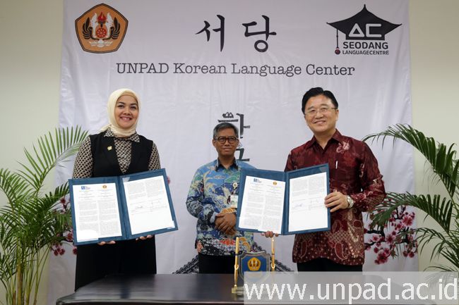 Vice Rector for Research, Community Engagement, Cooperation, and Academic Corporation Dr. Keri Lestari, S.Si., M.Sc., Apt., along with the Deputy Chair of the Indo-Korean Orthopedic Foundation (IKOF) Daniel Kim and witnessed by Unpad Rector Prof. Tri Hanggono Achmad signed a Cooperation Agreement on the Construction of the Korean Study Center in Unpad Central Library Building, Jatinangor, Wednesday (2/1). At the same time, the Rector also inaugurated the “Korean Language Center Unpad” facility. (Photo: Tedi Yusup) *