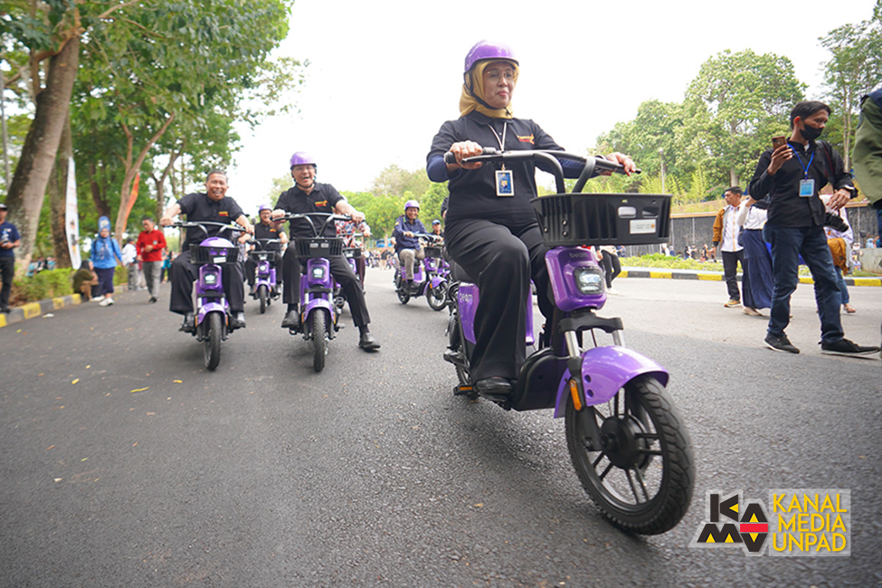 After being interviewed by the media team, the Rector of Unpad with Tatang Muttaqin, Asep Sukmayadi (Head of BPTI), Prof. Arief S. Kartasasmita (Chairperson of Pimnas 36), and several chiefs observed the innovation technology exhibition at Bale Santika Unpad, Jatinangor, using electric bike. (arm/SA)*