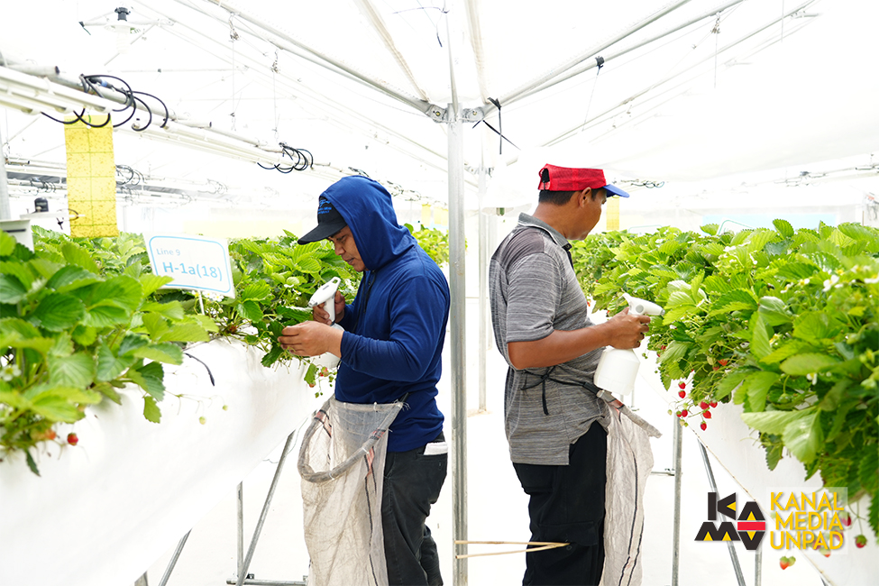 The process of cultivation was done in a specialized greenhouse which was built by Unpad and improved through a collaboration with the start-up Japan Premium Vegetable (JPV) and Japan International Research Centre for Agricultural Sciences (JIRCAS). The greenhouse was also updated with specialized tools and technology so that the desired strawberries can grow in the monsoon climate.