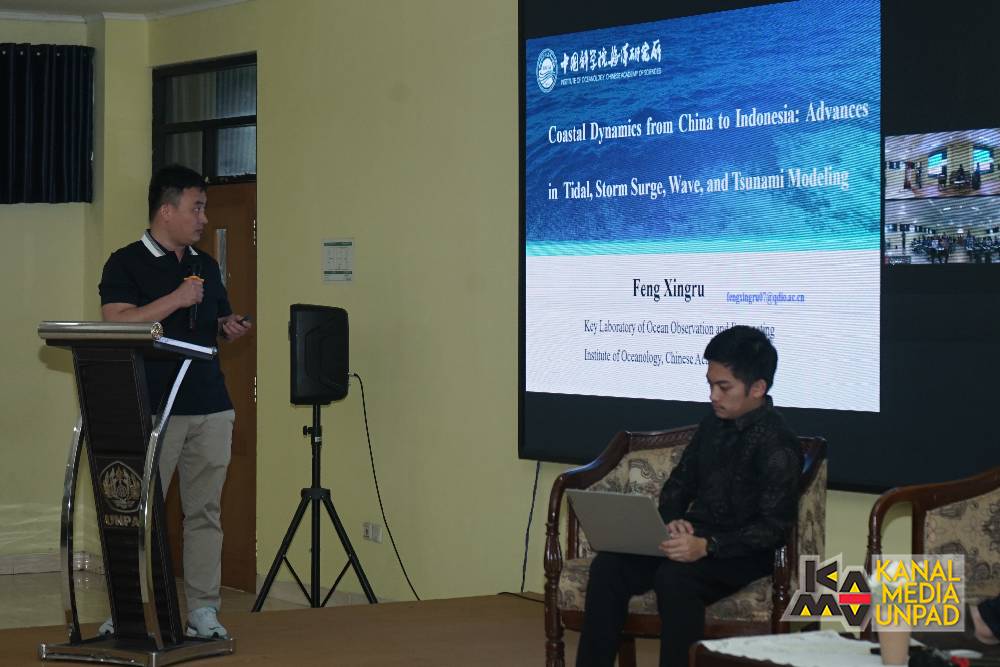 This event is open by the Dean of FPIK Unpad, Prof. Dr. sc.agr. Yudi Nurul Ihsan, S.Pi, M.Si, with an opening speech from the Head of Department of Marine Science, Dr. Sunarto, M.Si. The seminar series is began by the presentation from Prof. Dr. Feng XingRu,a research professor from IOCAS, which presents a material titled “Coastal Dynamics from China to Indonesia: Advances in Tidal, Storm Surge, Wave, and Tsunami Modeling”. in his presentation, Prof. Feng highlighted the importance of accurate ocean modelling in predicting the coastal disaster. With its long coastline and vulnerability to storm surges and tsunamis, Indonesia requires more advanced modelling technology to reduce the risk and impact of disasters.