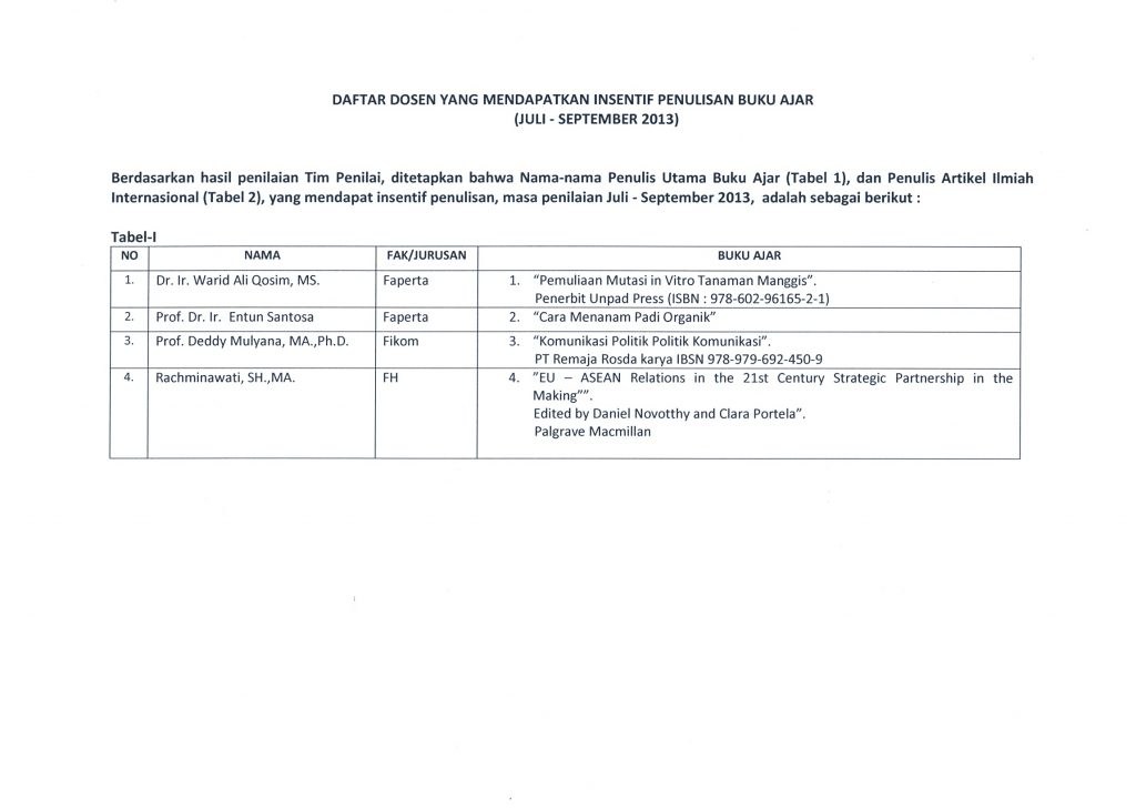 Pengumuman Daftar Dosen Penerima Insentif Penulisan Buku Ajar dan Artikel Ilmiah Internasional (Juli-September 2013) marlia 2013-10-22 1 min read 2013-10-22 Share this: Baca 1 menit 569 views Share this:
