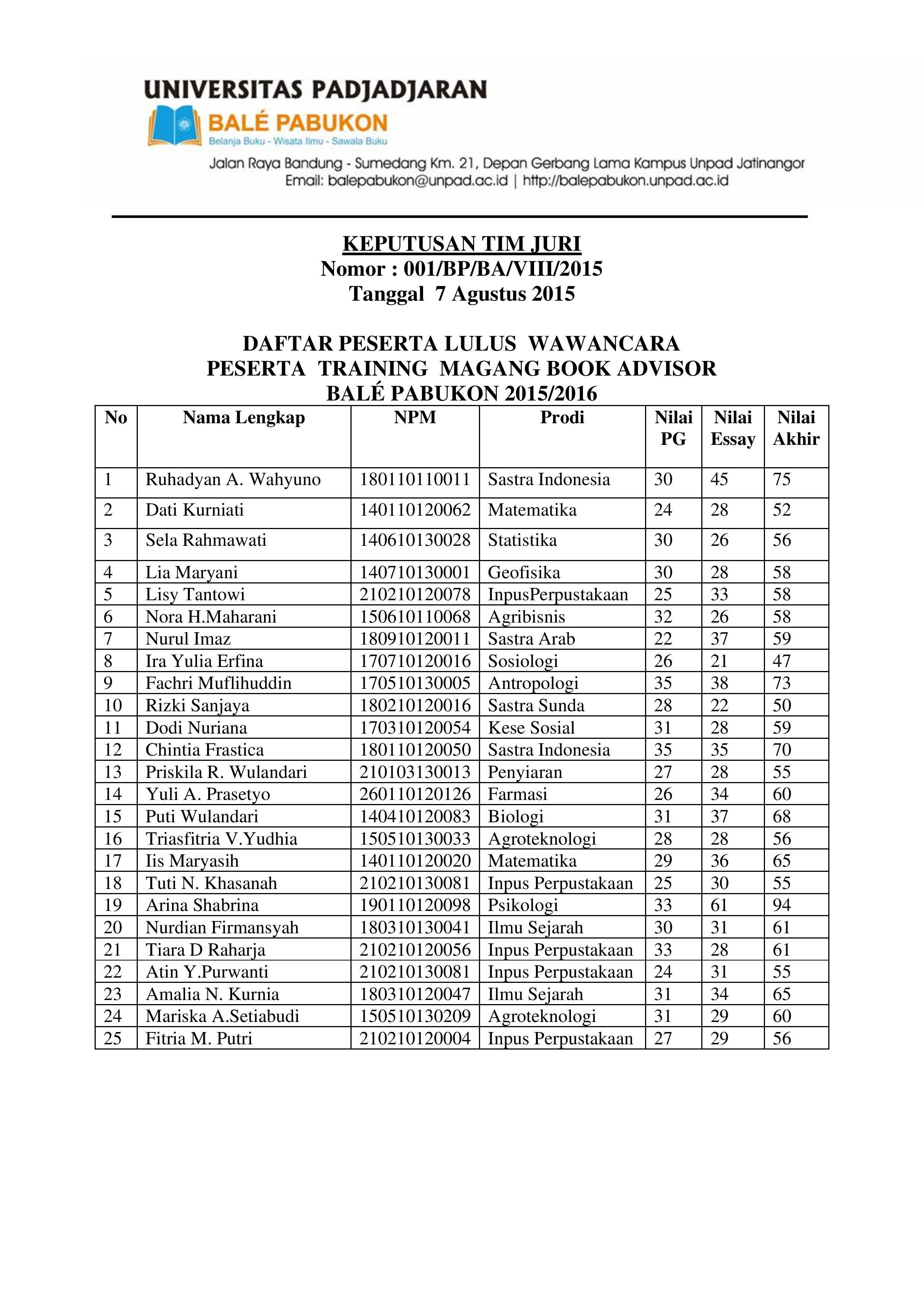 Pengumuman Daftar Peserta Lulus Wawancara Magang Book Advisor Bale Pabukon Unpad Kantor Komunikasi Publik 2015-08-10 1 min read 2015-08-10 Share this: Baca 1 menit 381 views Share this: