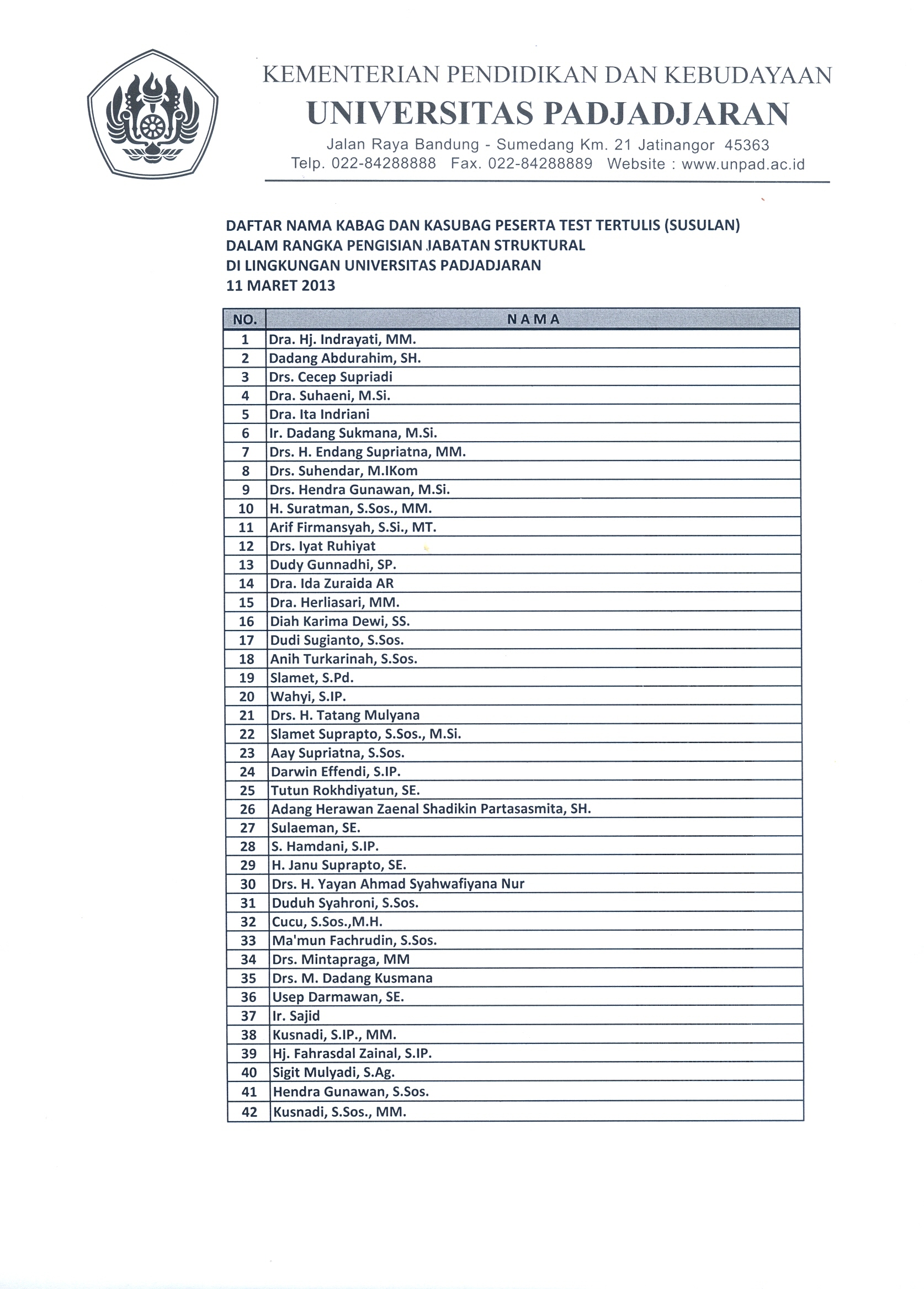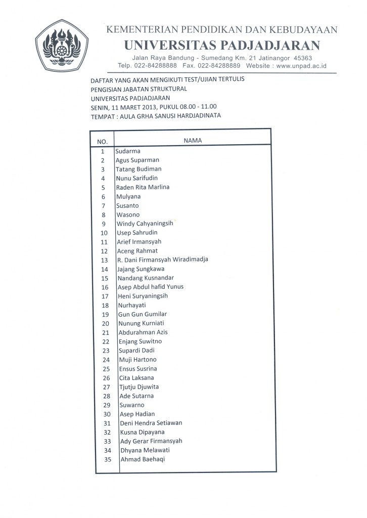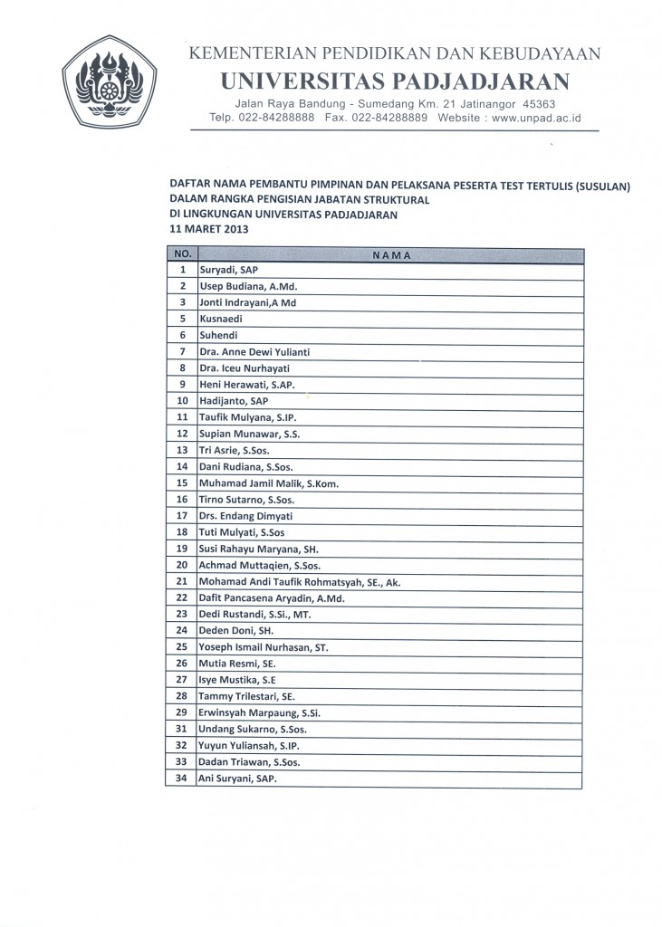 Pengumuman Daftar Peserta yang Akan Mengikuti Test / Ujian Tertulis Pengisian Jabatan Struktural Unpad Kantor Komunikasi Publik 2013-03-08 1 min read 2013-03-08 Share this: Baca 1 menit 589 views Share this: