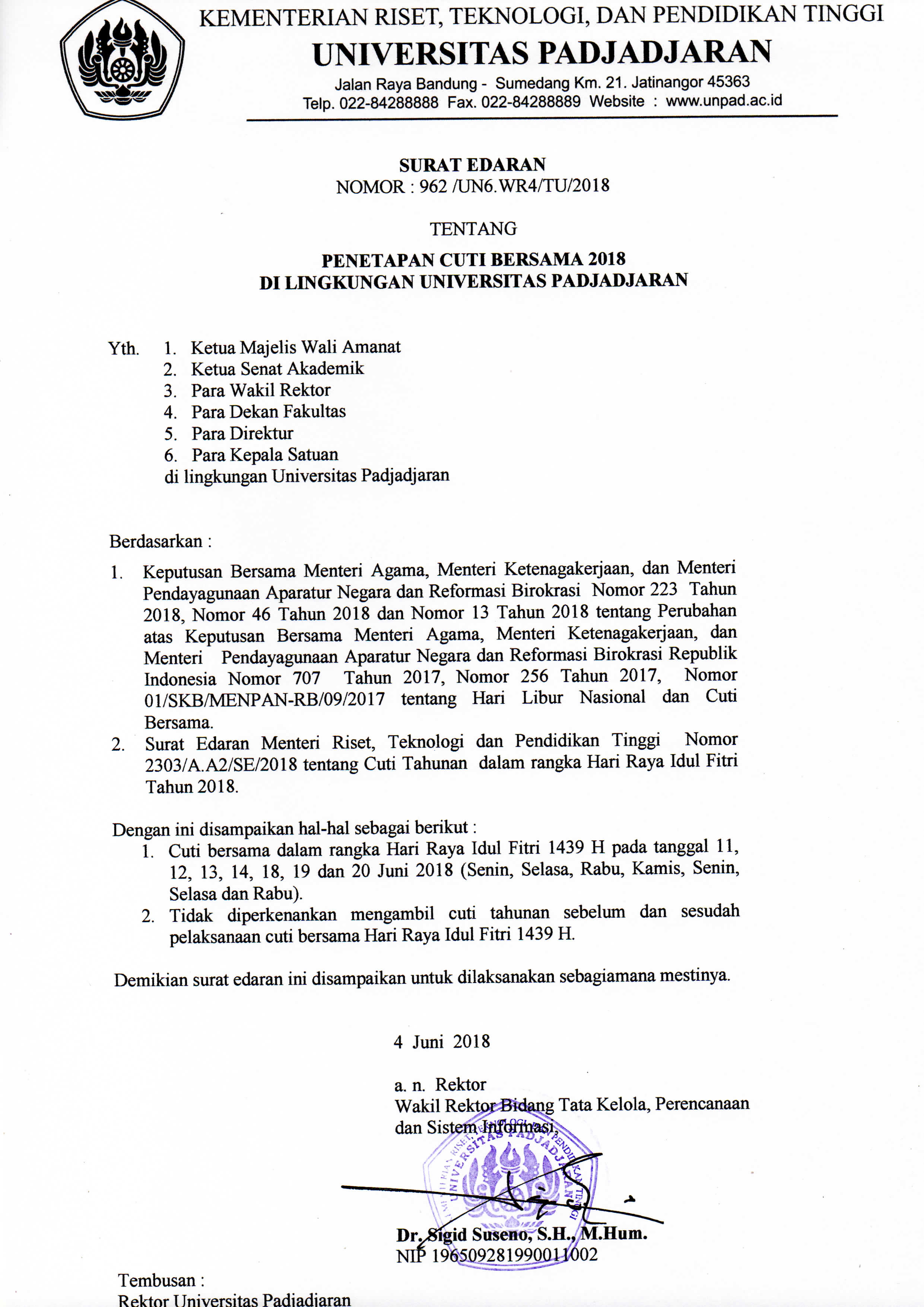 Pengumuman Edaran Cuti Bersama Idul Fitri 1438 H di Lingkungan Universitas Padjadjaran Kantor Komunikasi Publik 2018-06-05 1 min read 2018-06-05 Share this: Baca 1 menit 476 views Share this: