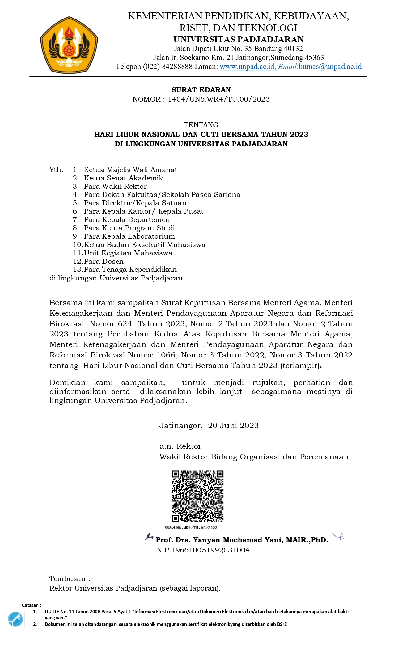 Pengumuman Edaran Hari Libur Nasional dan Cuti Bersama Tahun 2023 di Lingkungan Unpad Kantor Komunikasi Publik 2023-06-22 1 min read 2023-06-22 Share this: Baca 1 menit 1882 views Share this: