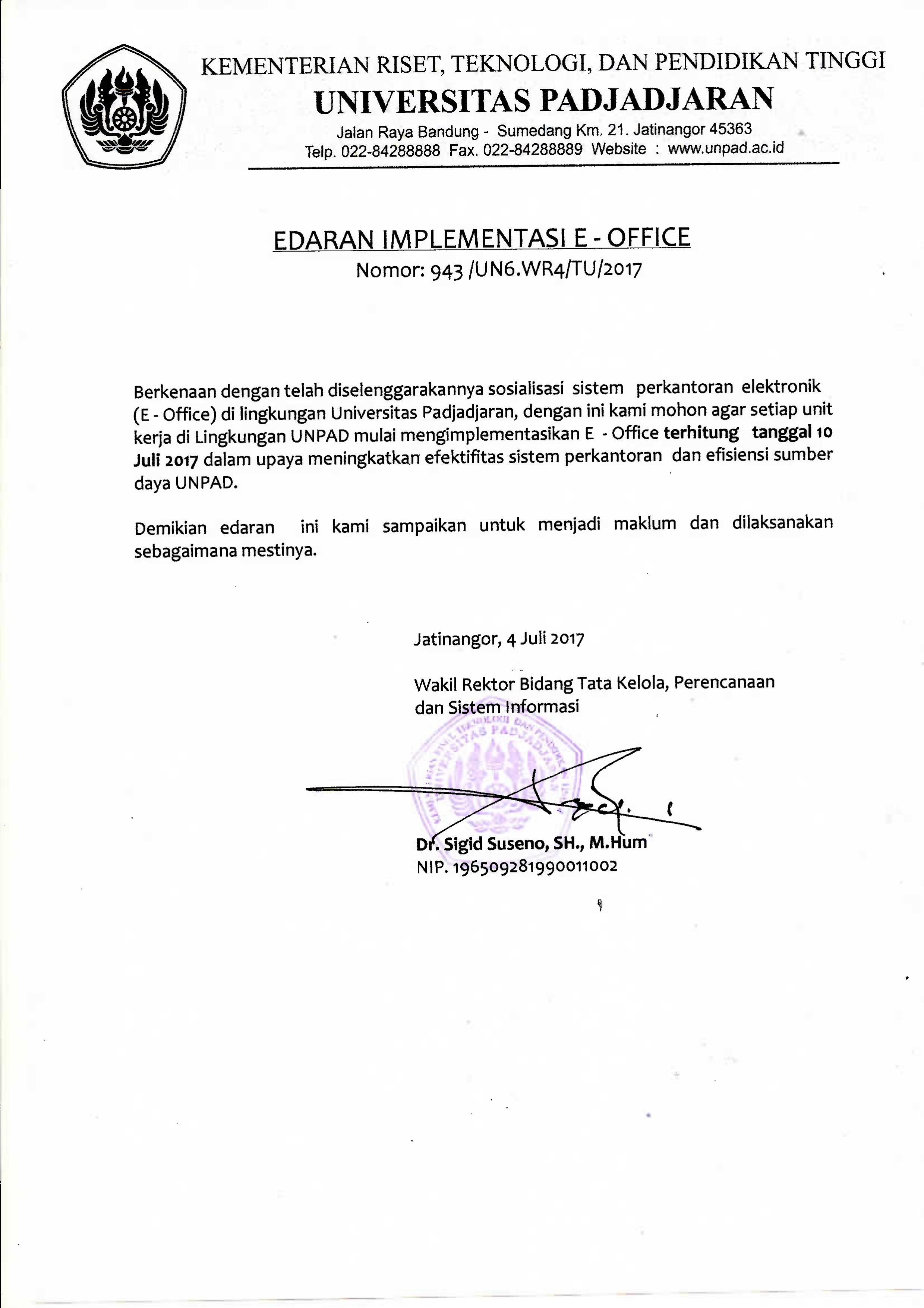 Pengumuman Edaran Implementasi E-Office di Lingkungan Kerja Universitas Padjadjaran Kantor Komunikasi Publik 2017-07-04 1 min read 2017-07-04 Share this: Baca 1 menit 379 views Share this: