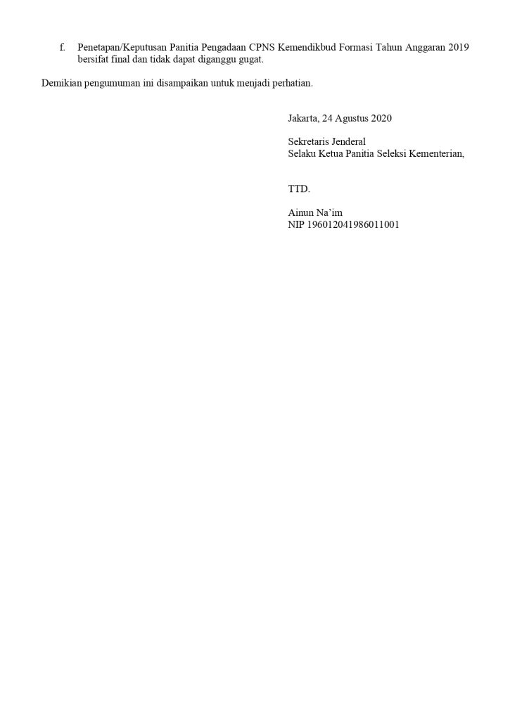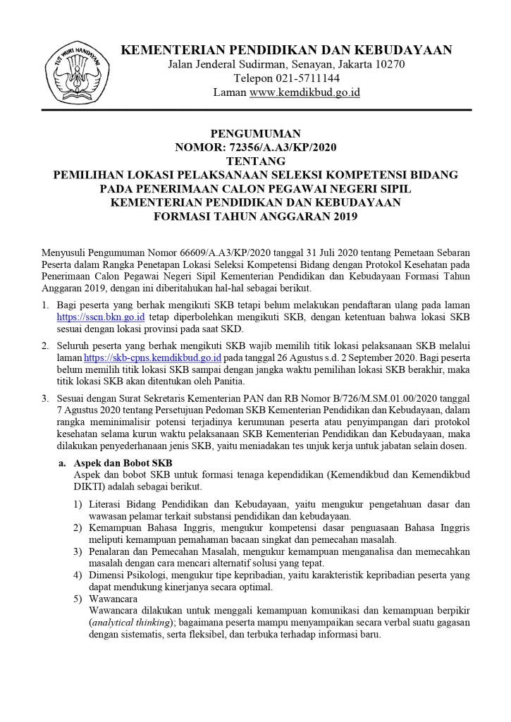 Pengumuman Edaran Pemilihan Lokasi Pelaksanaan Seleksi Kompetensi Bidang pada Penerimaan CPNS Kemendikbud Formasi Tahun Anggaran 2019 Kantor Komunikasi Publik 2020-08-25 1 min read 2020-08-25 Share this: Baca 1 menit 484 views Share this:
