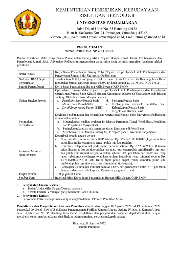 Pengumuman Edaran Pemilihan Mitra Kerja Sama Pemanfaatan BMN Berupa Tanah untuk Pembangunan dan Pengelolaan RS Unpad Kantor Komunikasi Publik 2022-08-18 1 min read 2022-08-18 Share this: Baca 1 menit 486 views Share this:
