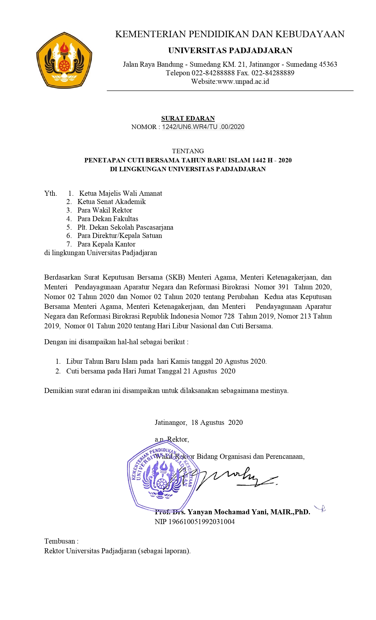 Pengumuman Edaran Penetapan Cuti Bersama Tahun Baru Islam 1442 H/2020 di Lingkungan Unpad Kantor Komunikasi Publik 2020-08-19 1 min read 2020-08-19 Share this: Baca 1 menit 984 views Share this: