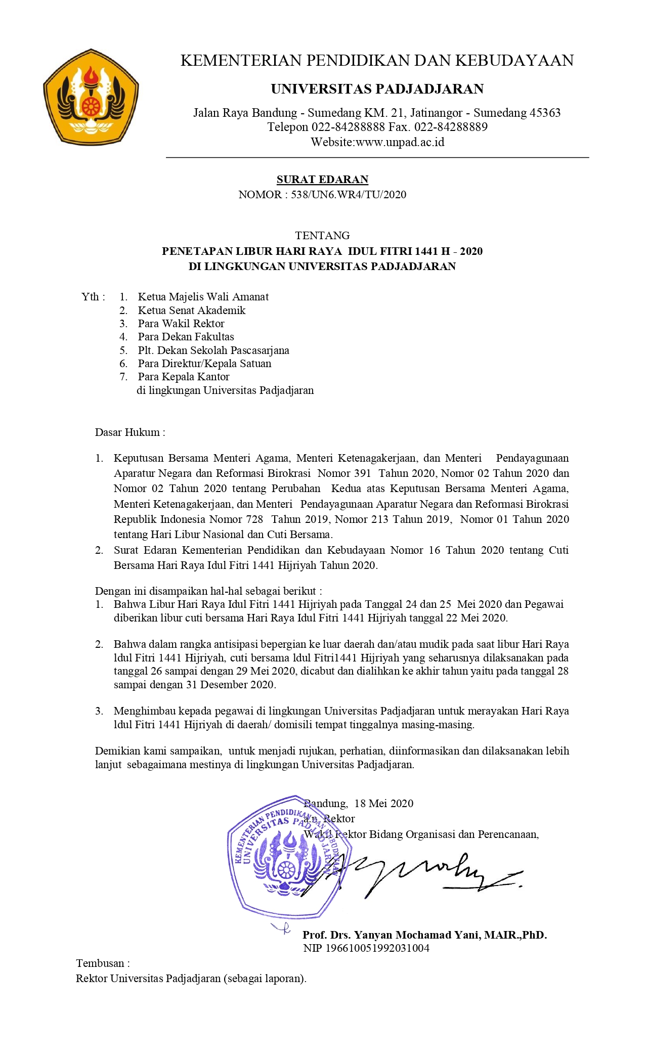 Pengumuman Edaran Penetapan Libur Hari Raya Idulfitri 1441 H di Lingkungan Unpad Kantor Komunikasi Publik 2020-05-19 1 min read 2020-05-19 Share this: Baca 1 menit 670 views Share this: