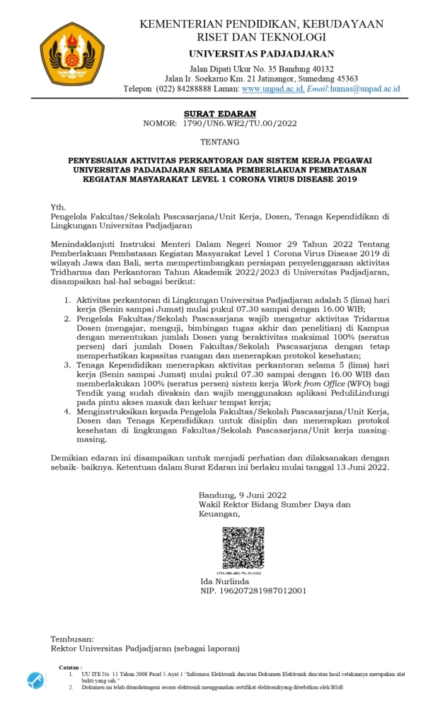 Pengumuman Edaran Penyesuaian Aktivitas Perkantoran dan Sistem Kerja Pegawai Unpad Selama PPKM Level I Kantor Komunikasi Publik 2022-06-09 1 min read 2022-06-09 Share this: Baca 1 menit 393 views Share this: