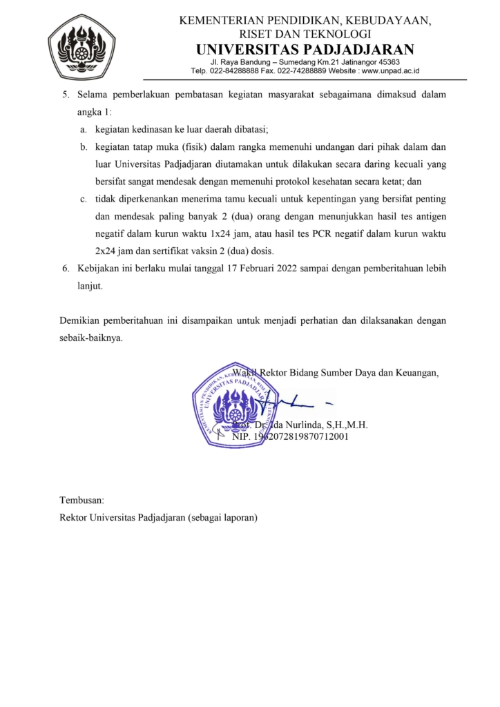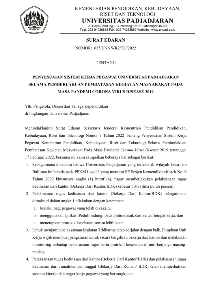 Pengumuman Edaran Penyesuaian Sistem Kerja Pegawai Unpad Selama Pemberlakukan PPKM Covid-19 Kantor Komunikasi Publik 2022-02-20 1 min read 2022-02-20 Share this: Baca 1 menit 666 views Share this: