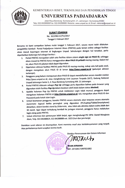Pengumuman Surat Edaran Pengaktifan Kembali Portal Padjadjaran Internet Akses (Pintas) Kantor Komunikasi Publik 2017-02-03 1 min read 2017-02-03 Share this: Baca 1 menit 923 views Share this: