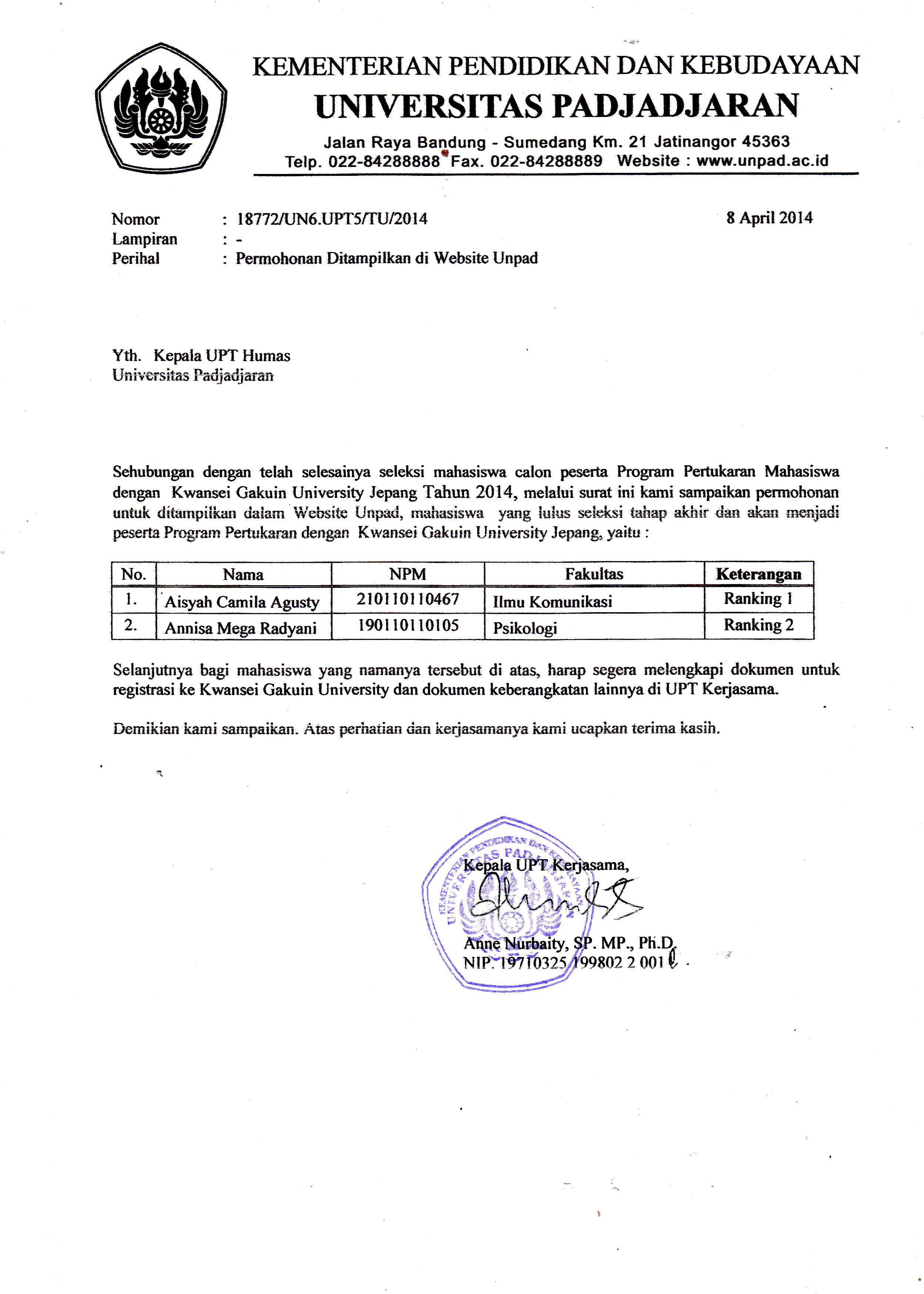 Pengumuman Hasil Akhir Seleksi Program Pertukaran Mahasiswa dengan Kwansei Gakuin University Jepang Kantor Komunikasi Publik 2014-04-10 1 min read 2014-04-10 Share this: Baca 1 menit 347 views Share this: