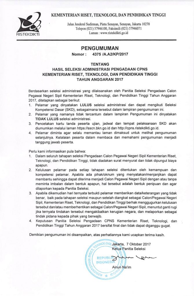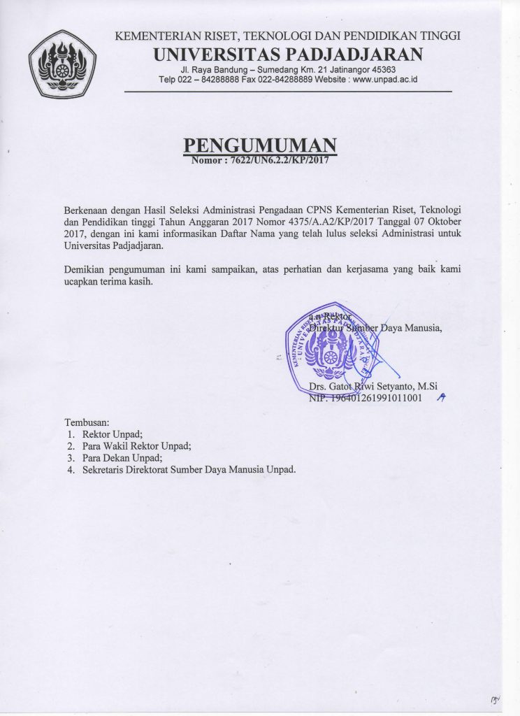Pengumuman Hasil Seleksi Administrasi Pengadaan CPNS Kemenristekdikti T.A. 2017 untuk Universitas Padjadjaran Kantor Komunikasi Publik 2017-10-09 1 min read 2017-10-09 Share this: Baca 1 menit Lampiran Hasil Seleksi Administrasi Penerimaan CPNS Kemenristekdikti T.A. 2017 – Universitas Padjadjaran 537 views Share this:
