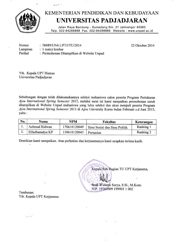 Pengumuman Hasil Seleksi Pertukaran Mahasiswa Ajou International Spring Semester 2015 Kantor Komunikasi Publik 2014-10-23 1 min read 2014-10-23 Share this: Baca 1 menit 219 views Share this: