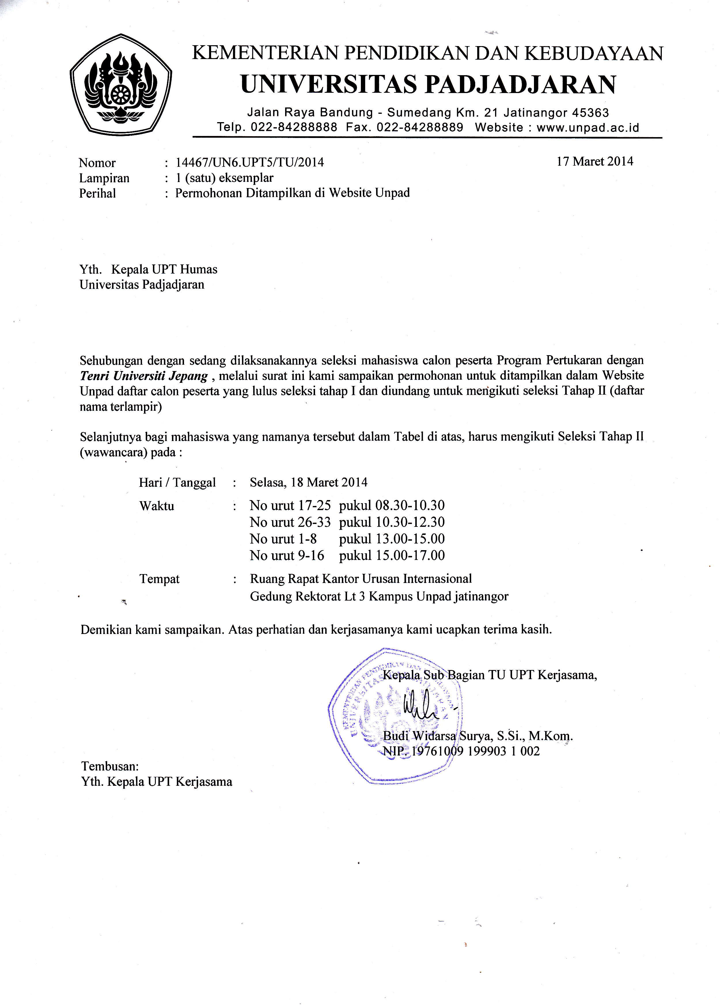 Pengumuman Hasil Seleksi Tahap 1 Program Pertukaran dengan Tenri University Jepang Kantor Komunikasi Publik 2014-03-17 1 min read 2014-03-17 Share this: Baca 1 menit Silakan unduh daftar nama Calon Peserta yang Lulus Tahap I Program Pertukaran dengan Tenri University 605 views Share this: