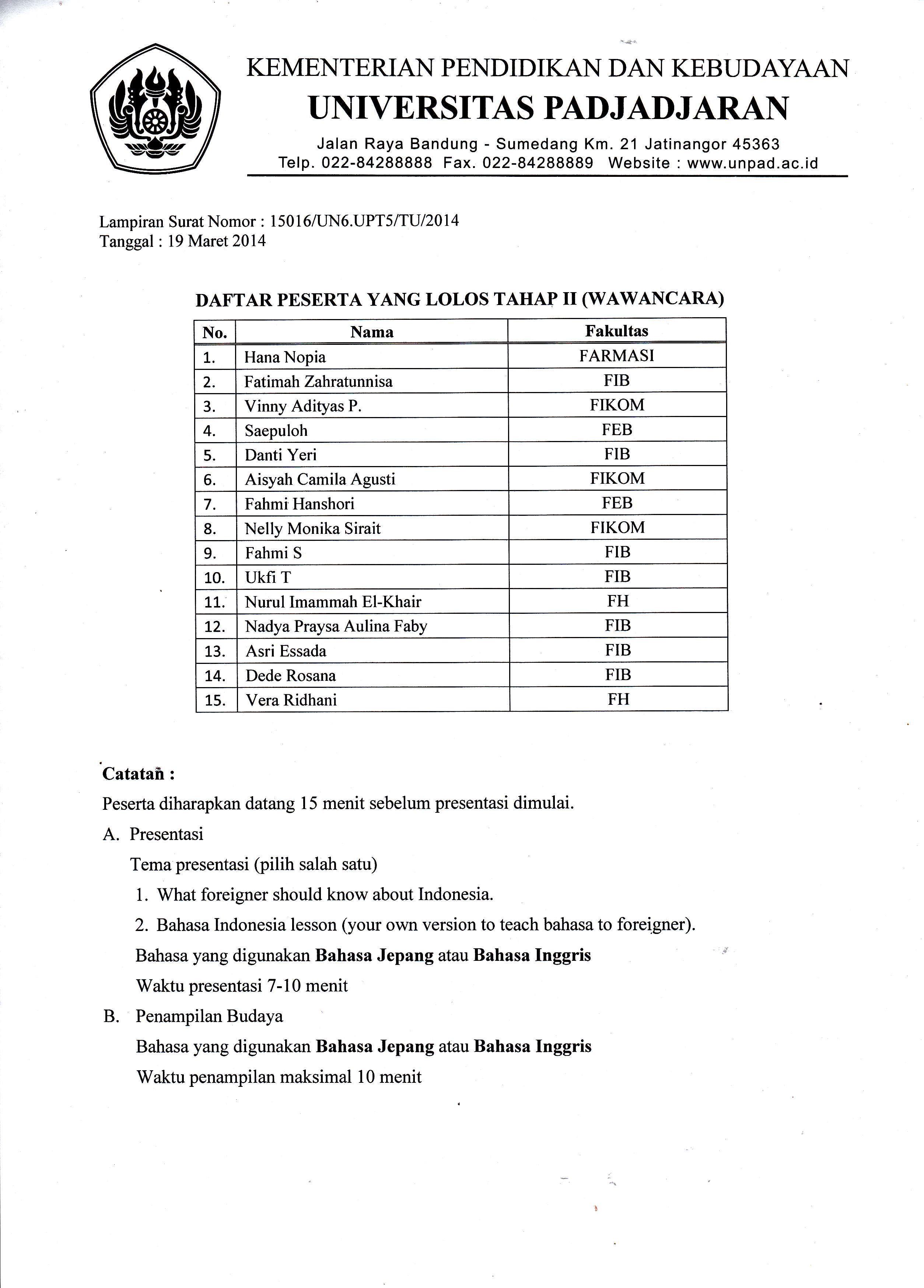 Daftar nama calon peserta yang lulus seleksi tahap 2 dan diundang mengikuti seleksi tahap 3 (presentasi dan penampilan budaya) Program Pertukaran dengan Tenri University Jepang pada: