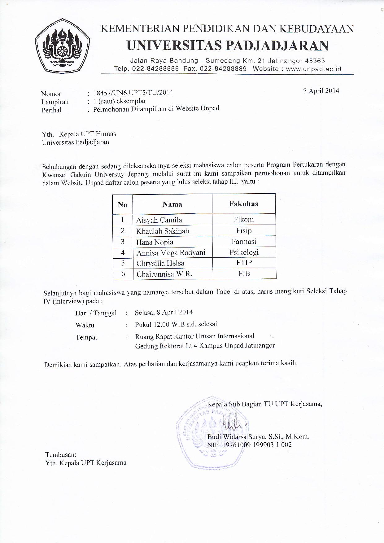 Pengumuman Hasil Seleksi Tahap III Program Pertukaran Mahasiswa dengan Kwansei Gakuin University Jepang Kantor Komunikasi Publik 2014-04-07 1 min read 2014-04-07 Share this: Baca 1 menit 267 views Share this: