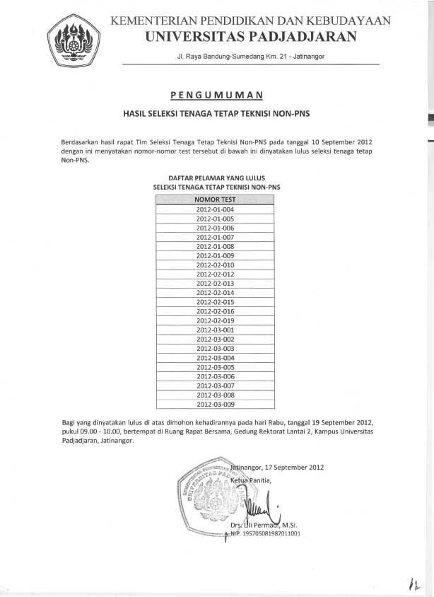 Pengumuman Hasil Seleksi Tenaga Tetap Teknisi Non-PNS marlia 2012-09-18 1 min read 2012-09-18 Share this: Baca 1 menit Ralat: Para pelamar yang dinyatakan lulus dimohon kehadirannya pada Rabu, 19 September 2012 pukul. 11.00 WIB. Versi PDF 506 views Share this: