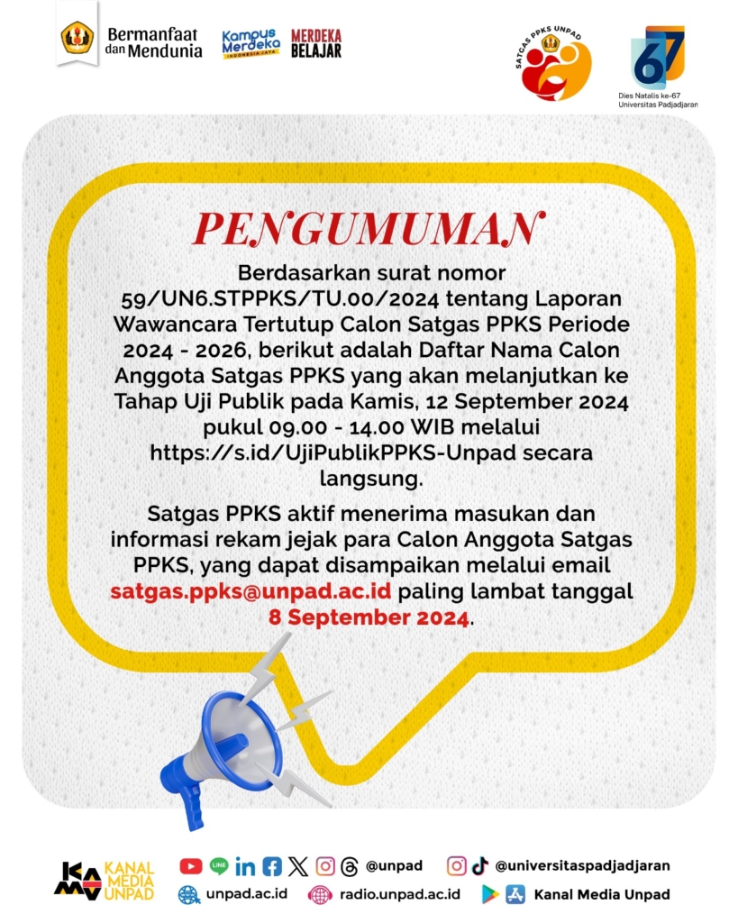 Satgas PPKS aktif menerima masukan dan informasi rekam jejak para Calon Anggota Satgas PPKS, yang dapat disampaikan melalui email satgas.ppks@unpad.ac.id atau WhatsApp 08112200424 paling lambat 8 September 2024. Proses seleksi selanjutnya adalah proses uji publik untuk mendapatkan masukan dari masyarakat pada Kamis, 12 Ssptember 2024 pukul 09.00-14.00 WIB melalui s.id/UjiPublikPPKS-Unpad.