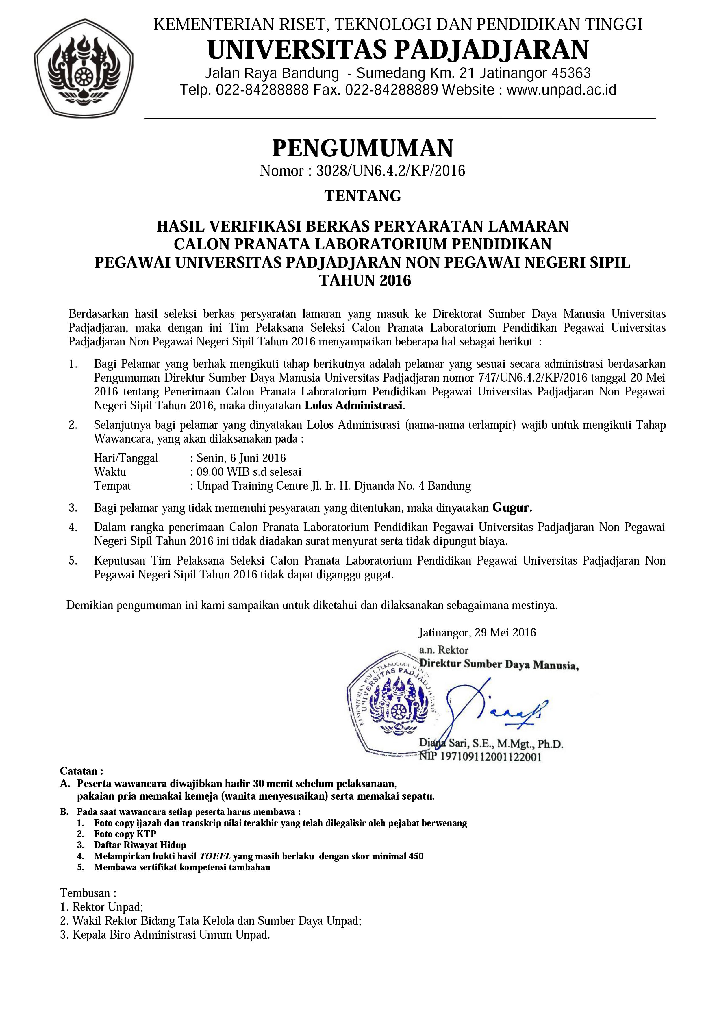 Pengumuman Hasil Verifikasi Berkas Calon Pranata Laboratorium Pendidikan Pegawai Unpad Non PNS Kantor Komunikasi Publik 2016-05-29 1 min read 2016-05-29 Share this: Baca 1 menit 511 views Share this: