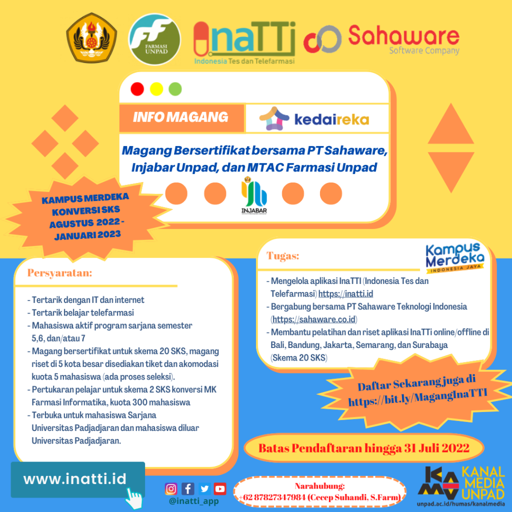 Pengumuman Info Magang Besertifikat Bersama PT. Sahaware, Injabar Unpad, dan MTAC Farmasi Unpad Kantor Komunikasi Publik 2022-07-22 1 min read 2022-07-22 Share this: Baca 1 menit 1248 views Share this: