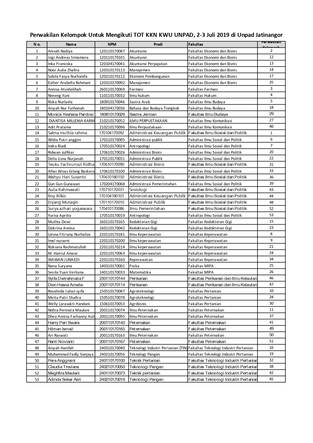 Melalui informasi ini, disampaikan nama-nama anggota kelompok KKN kewirausahaan Unpad yang akan dimulai tanggal 9 Juli 2019.