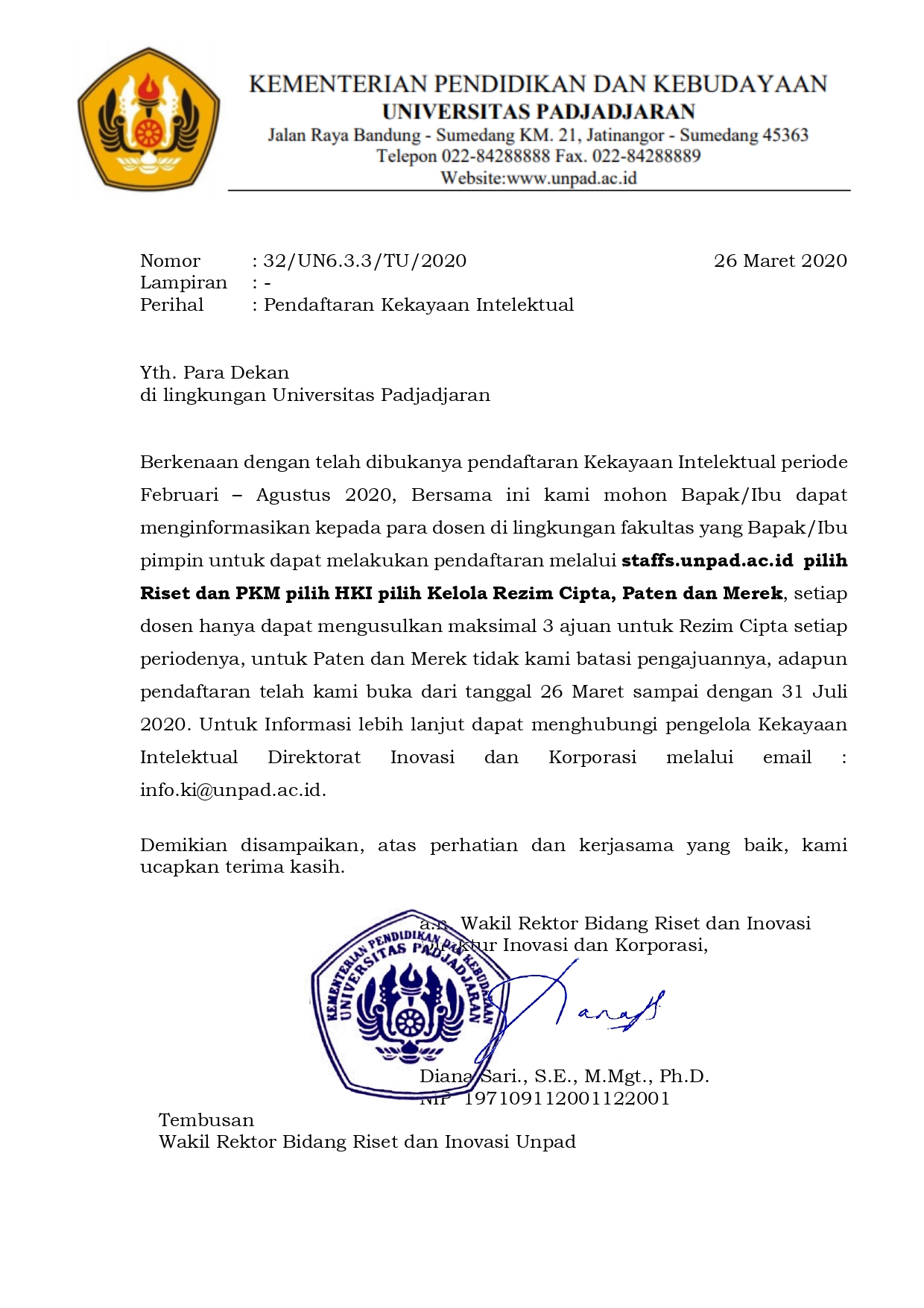 Pengumuman Informasi Pendaftaran Kekayaan Intelektual di Lingkungan Unpad Kantor Komunikasi Publik 2020-04-03 1 min read 2020-04-03 Share this: Baca 1 menit 532 views Share this: