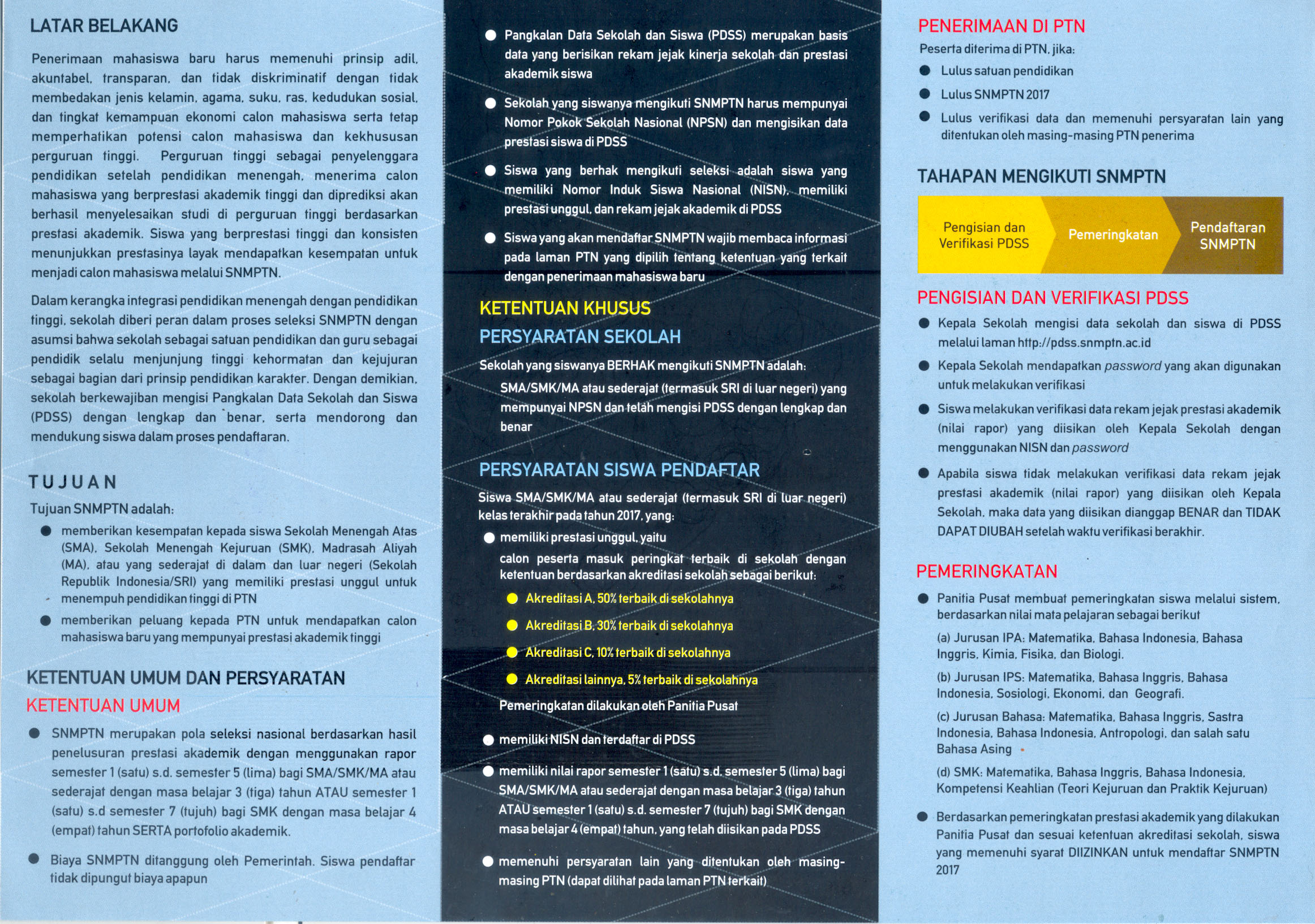 Pengumuman Informasi Seleksi Nasional Masuk Perguruan Tinggi Negeri 2017 Kantor Komunikasi Publik 2017-03-21 1 min read 2017-03-21 Share this: Baca 1 menit 390 views Share this: