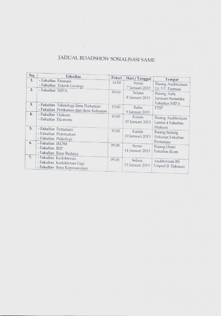 Pengumuman Jadwal Roadshow Sosialisasi Program SAME marlia 2013-01-07 1 min read 2013-01-07 Share this: Baca 1 menit 1025 views Share this: