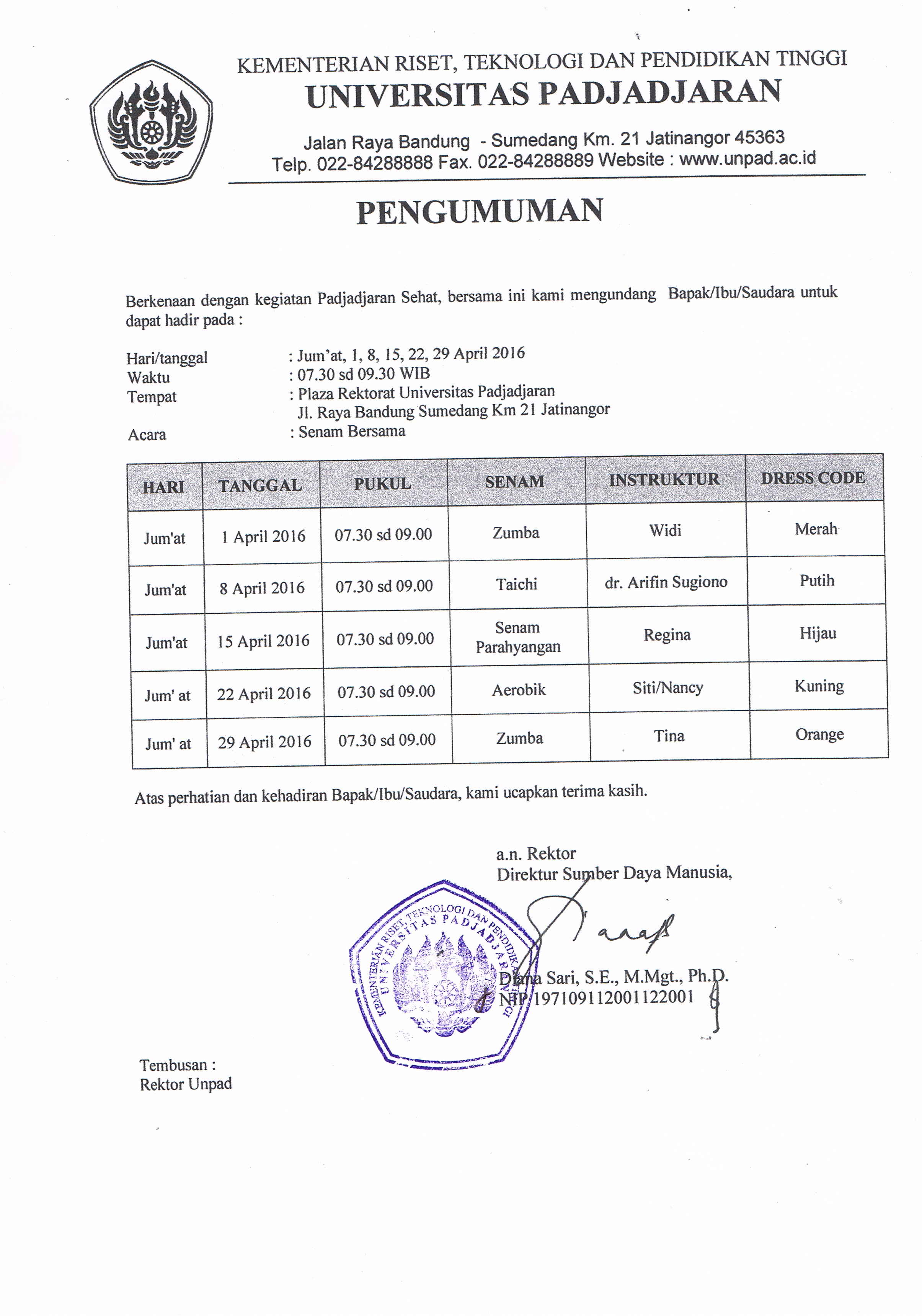 Pengumuman Jadwal Senam Bersama “Padjadjaran Sehat” April 2016 Kantor Komunikasi Publik 2016-03-28 1 min read 2016-03-28 Share this: Baca 1 menit 337 views Share this:
