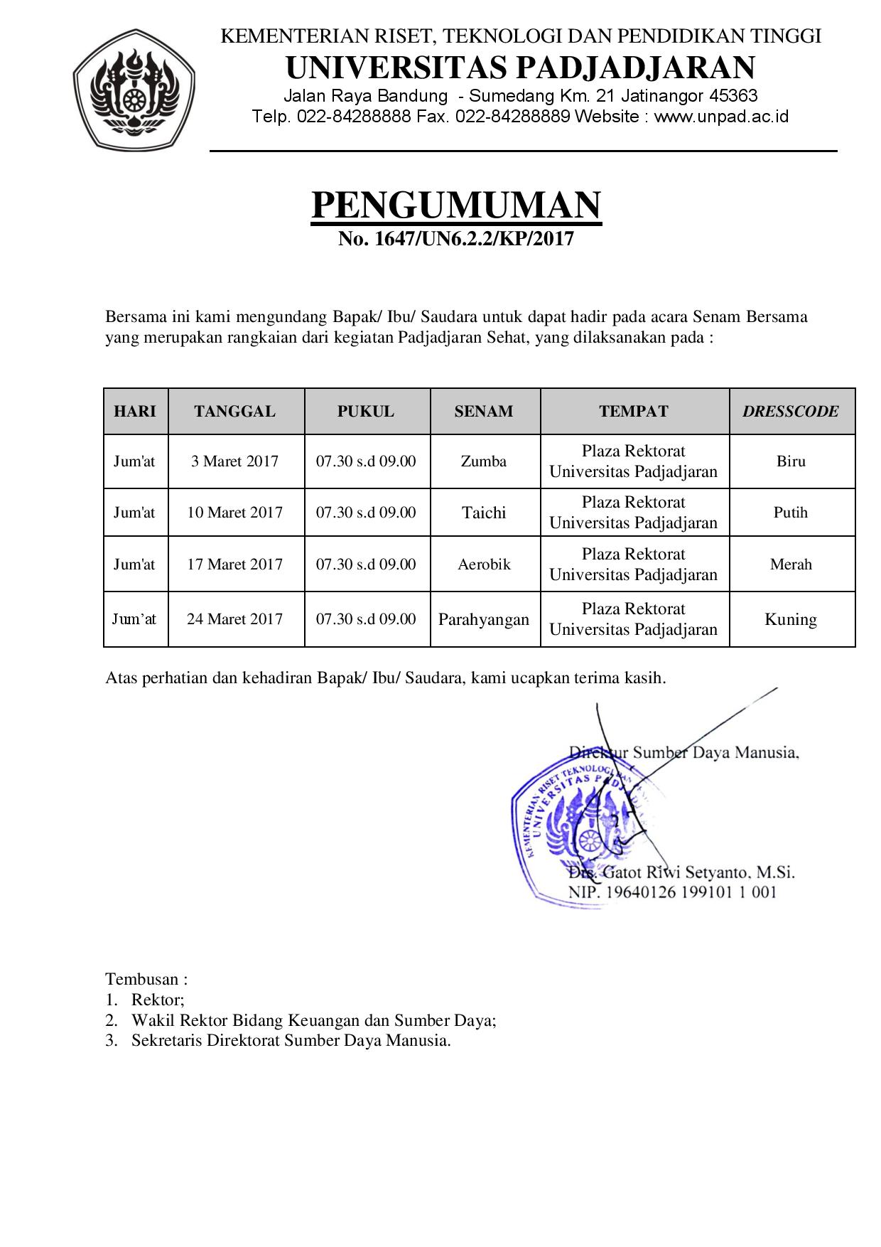 Pengumuman Jadwal Senam Bersama Padjadjaran Sehat Bulan Maret 2017 Kantor Komunikasi Publik 2017-03-02 1 min read 2017-03-02 Share this: Baca 1 menit 217 views Share this:
