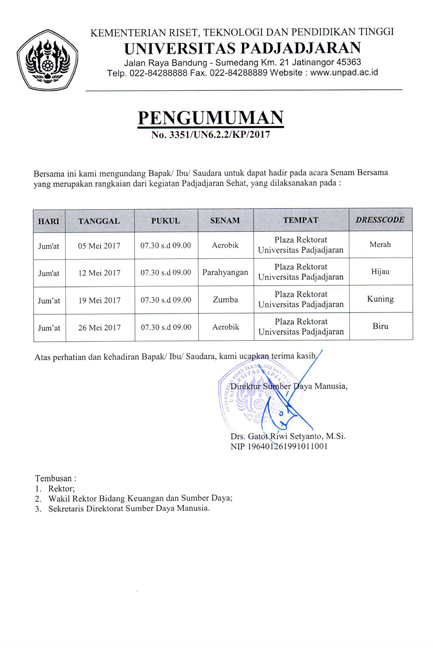 Pengumuman Jadwal Senam Bersama Padjadjaran Sehat Bulan Mei 2017 Kantor Komunikasi Publik 2017-05-04 1 min read 2017-05-04 Share this: Baca 1 menit 196 views Share this: