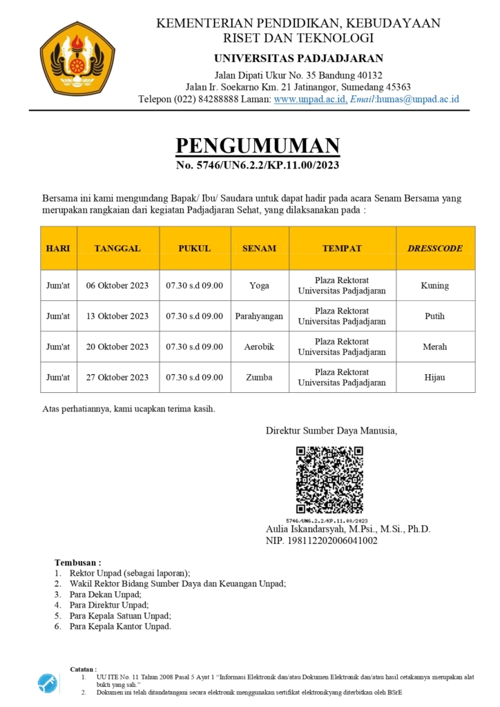 Pengumuman Jadwal Senam Bersama Padjadjaran Sehat Bulan Oktober 2023 Kantor Komunikasi Publik 2023-10-06 1 min read 2023-10-06 Share this: Baca 1 menit 1951 views Share this: