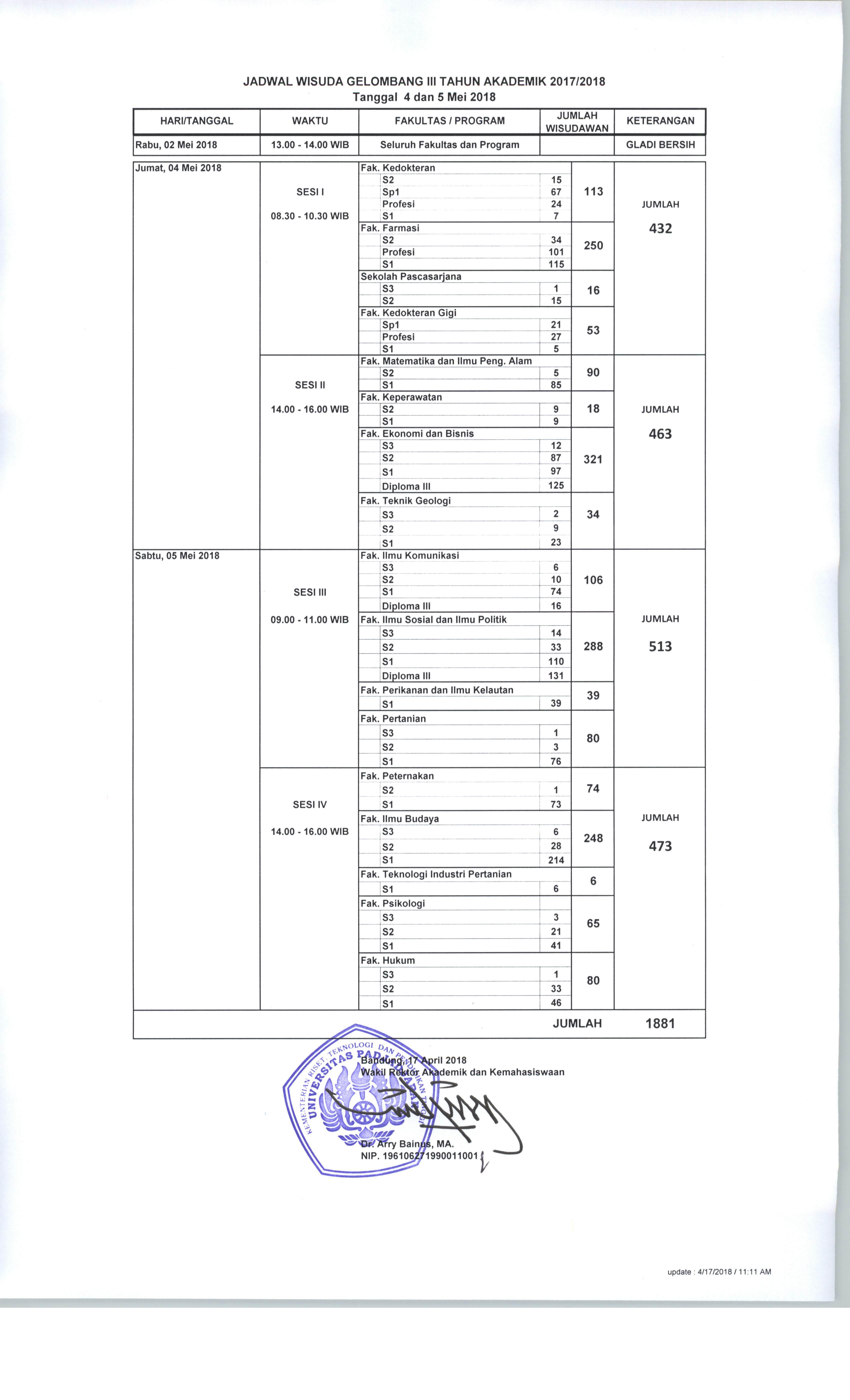 Pengumuman Jadwal Wisuda Gelombang III 2017/2018 Kantor Komunikasi Publik 2018-04-17 1 min read 2018-04-17 Share this: Baca 1 menit 406 views Share this: