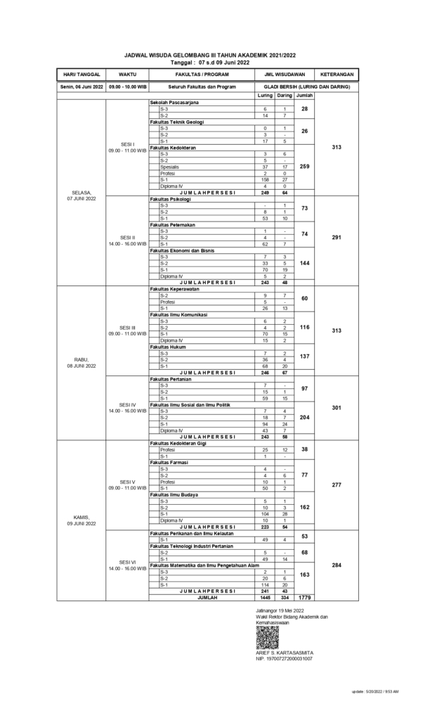 Pengumuman Jadwal Wisuda Gelombang III Tahun Akademik 2021/2022 Kantor Komunikasi Publik 2022-05-25 1 min read 2022-05-25 Share this: Baca 1 menit 4455 views Share this: