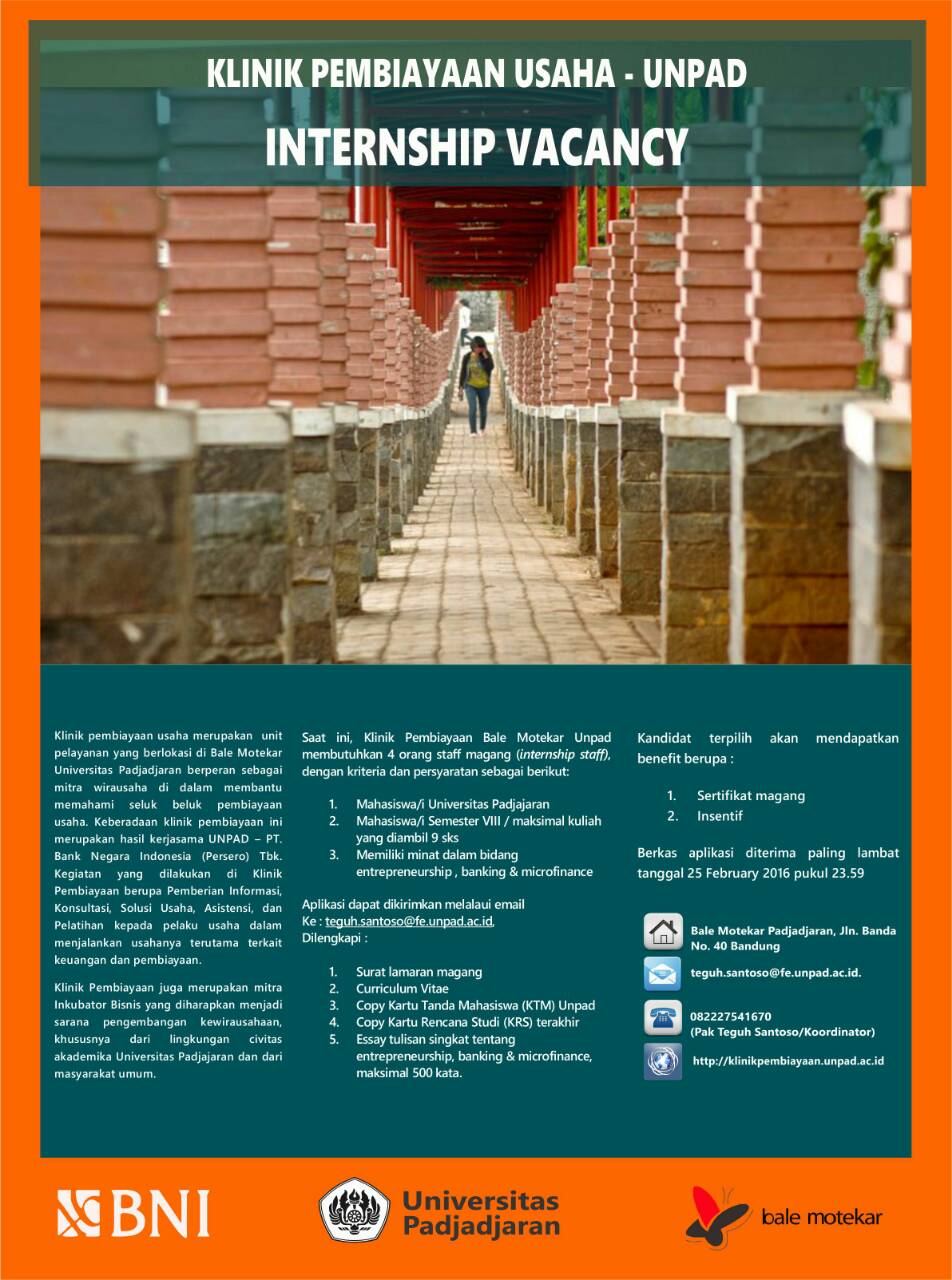 Pengumuman Kesempatan Magang di Klinik Pembiayaan Usaha Unpad Kantor Komunikasi Publik 2016-02-18 1 min read 2016-02-18 Share this: Baca 1 menit 316 views Share this: