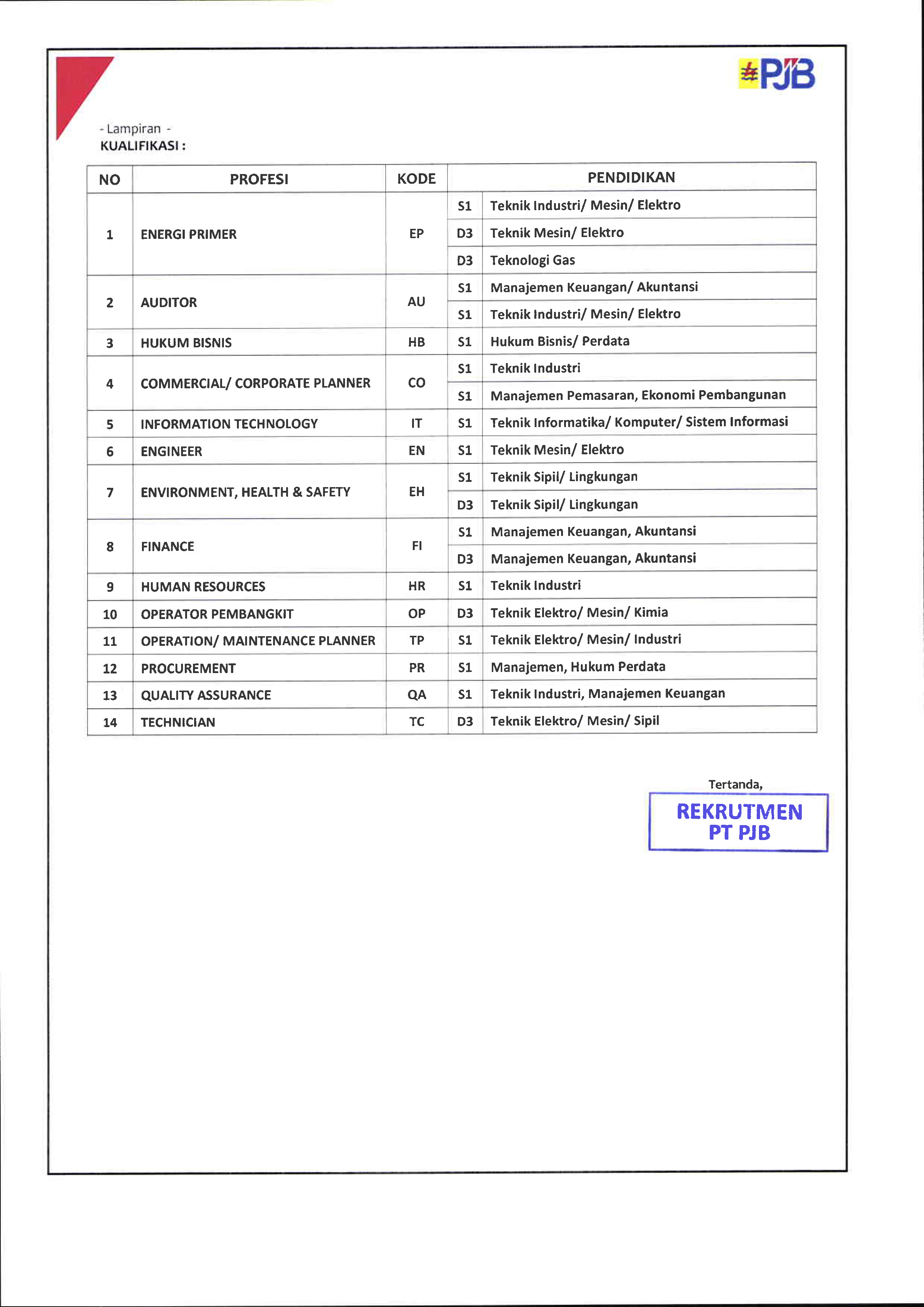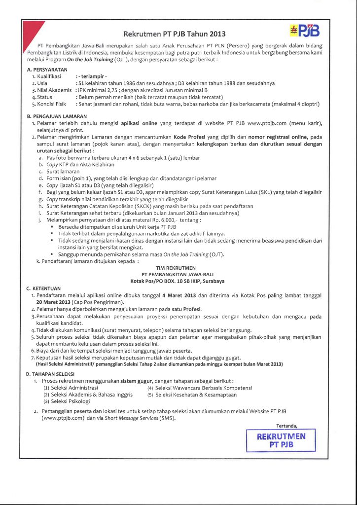 Pengumuman Lowongan Kerja di PT Pembangkitan Jawa-Bali Tahun 2013 Kantor Komunikasi Publik 2013-03-04 1 min read 2013-03-04 Share this: Baca 1 menit 805 views Share this: