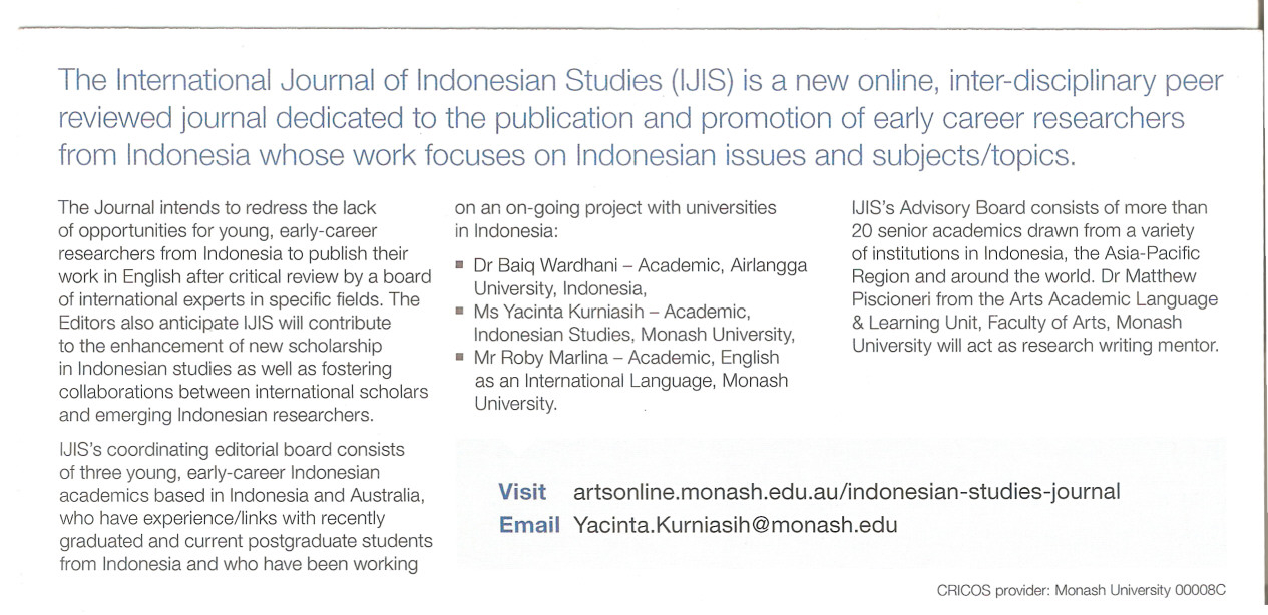 Pengumuman Peluang Menerbitkan Karya Ilmiah di The International Journal of Indonesian Studies (IJIS) Monash University Kantor Komunikasi Publik 2013-02-21 1 min read 2013-02-21 Share this: Baca 1 menit 458 views Share this: